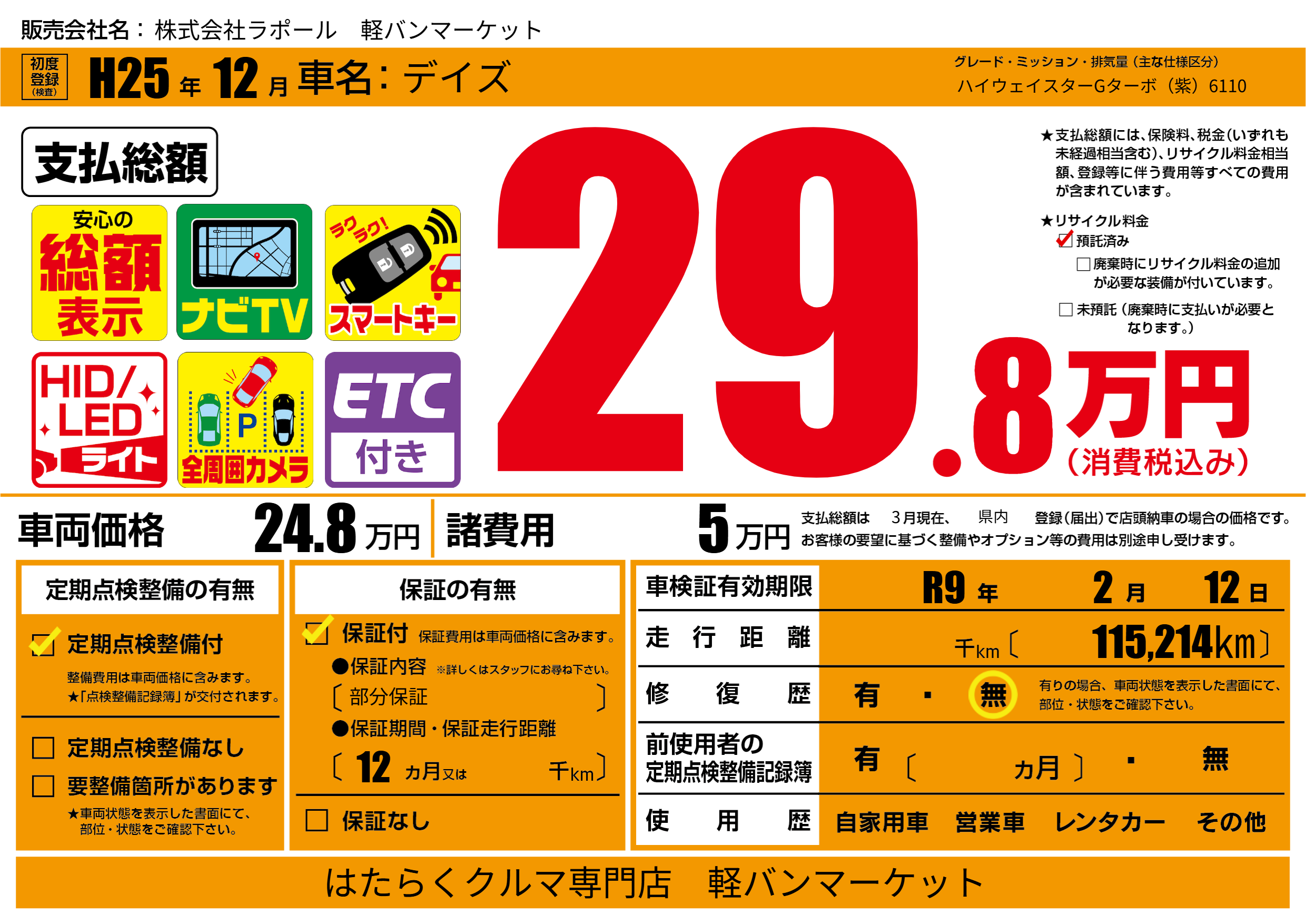 | 走行キロ | - | 初年度登録 | H25年12月 |