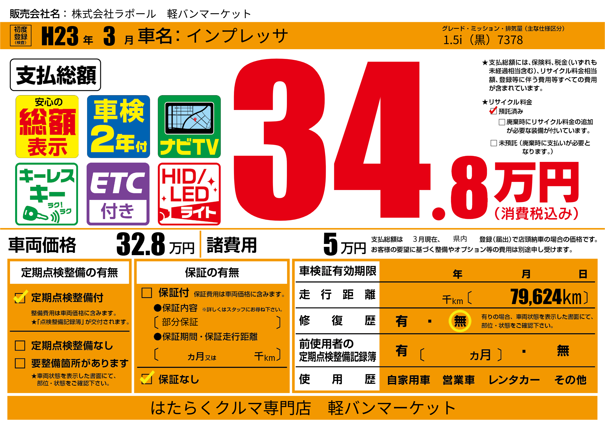 | 走行キロ | - | 初年度登録 | H23年3月 |
