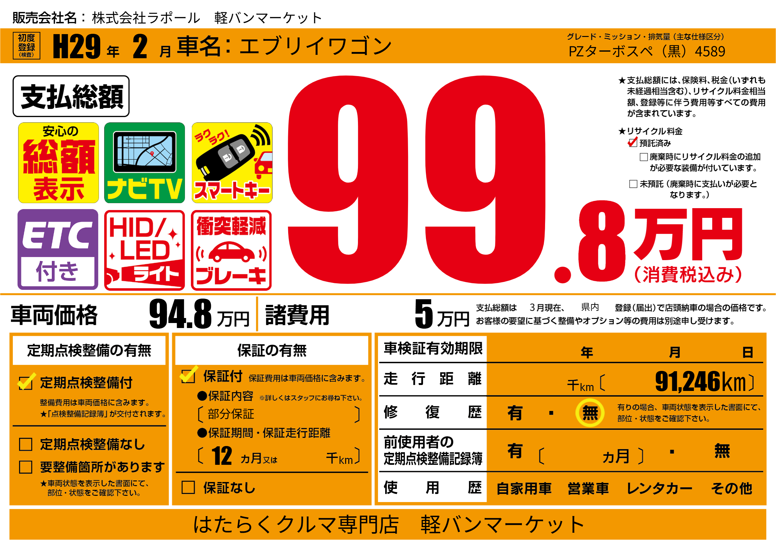 | 車名 | エブリイワゴン | グレード ミッション 排気量 |