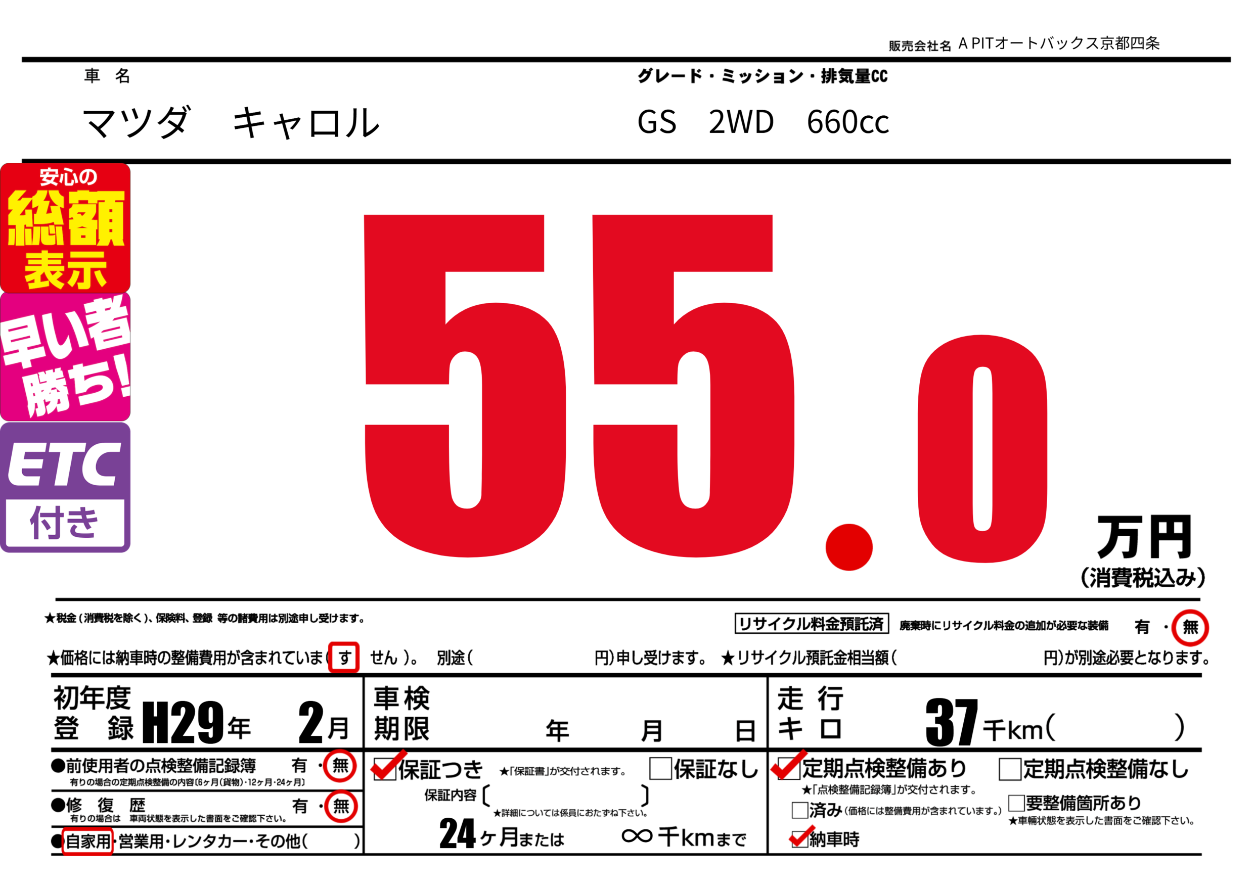| 車名 | マツダ キャロル | グレード ミッション 排気量 |