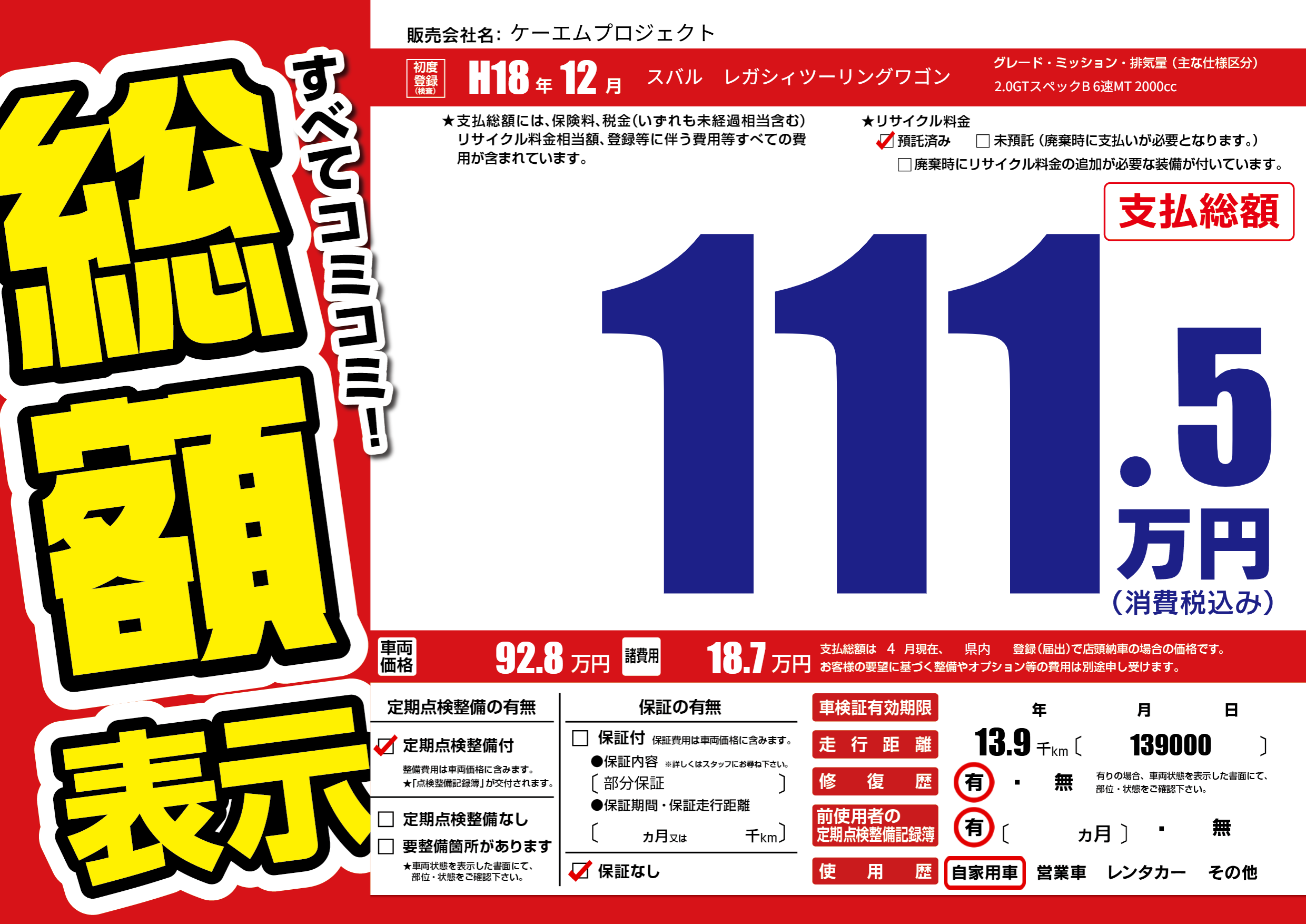 | 車名 | スバル レガシィツーリングワゴン | グレード ミッション 排気量 |