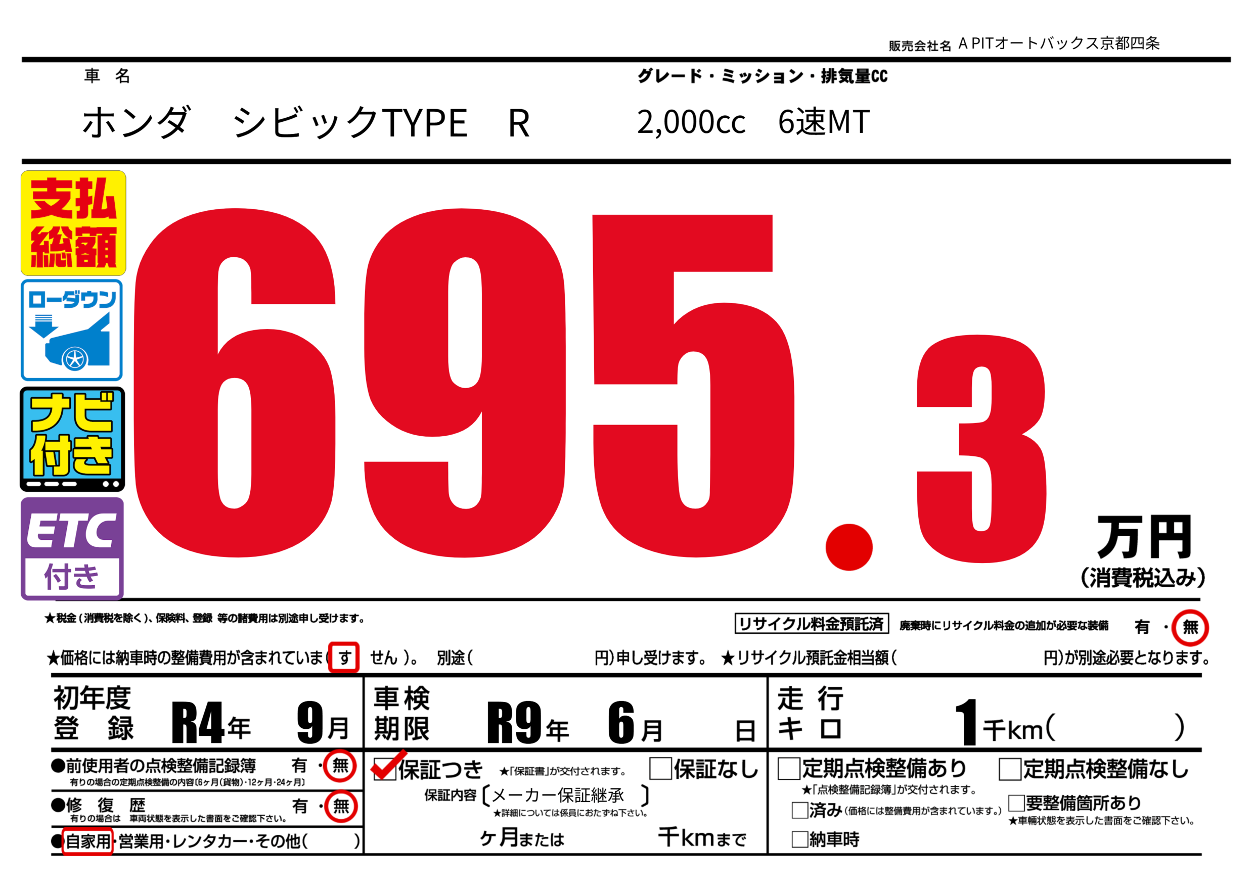 | 車検制限 | R9年 6月 - 日 | ||