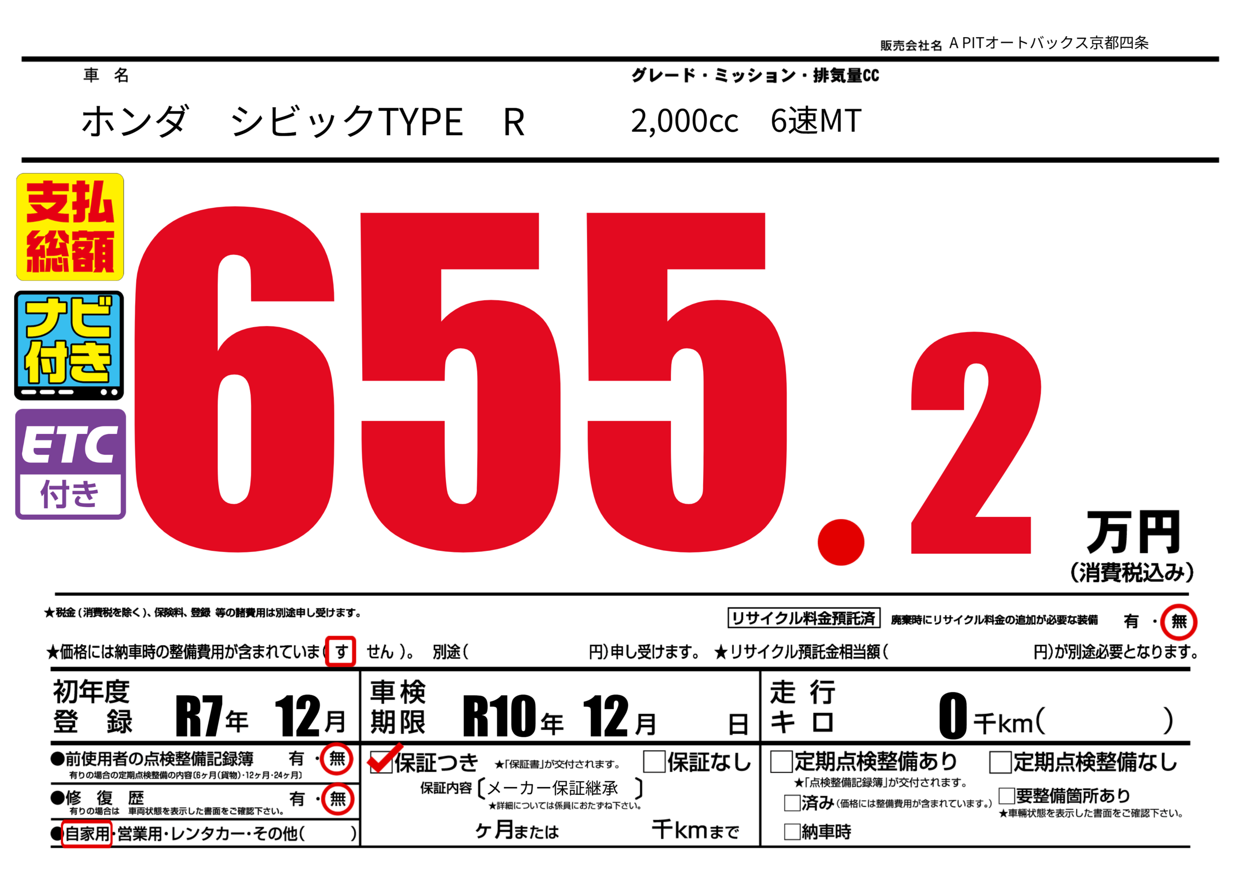 | 車名 | ホンダ シビックTYPE R | グレード ミッション 排気量 |
