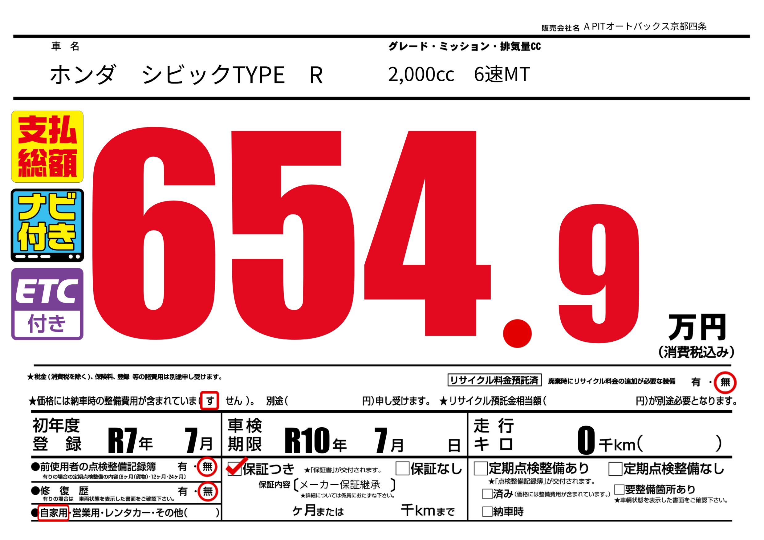 | 車名 | ホンダ シビックTYPE R | グレード ミッション 排気量 |