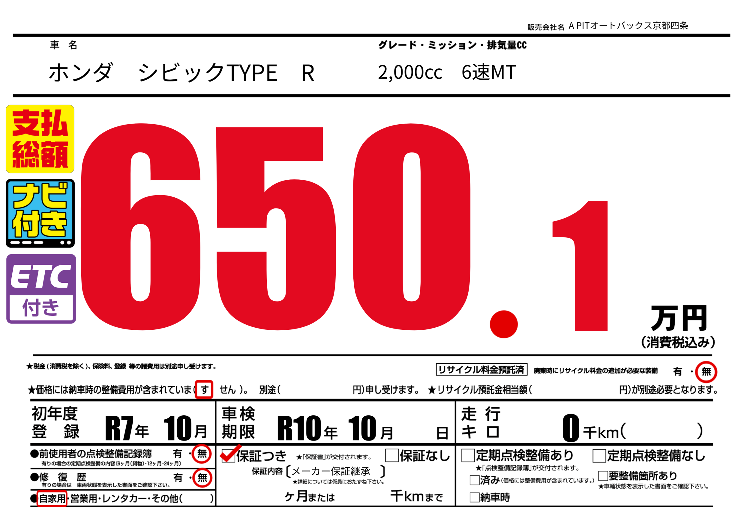 | 車検制限 | R10年 10月 - 日 | ||