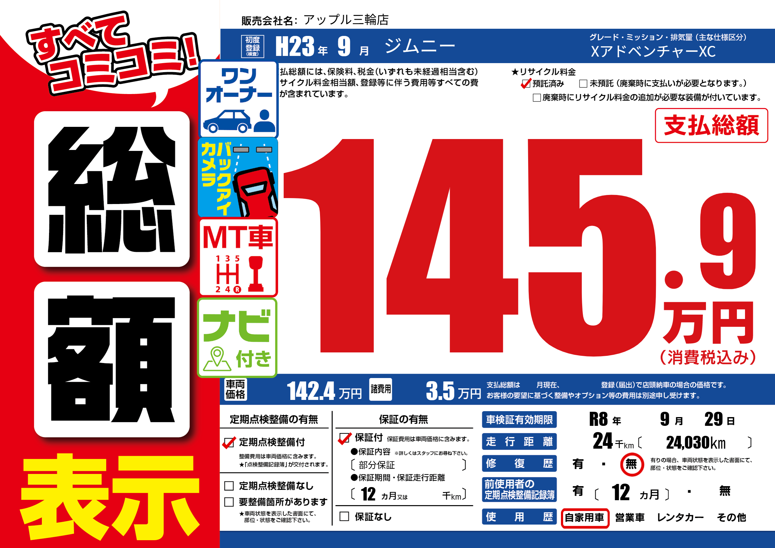 | 車名 | ジムニー | グレード ミッション 排気量 |