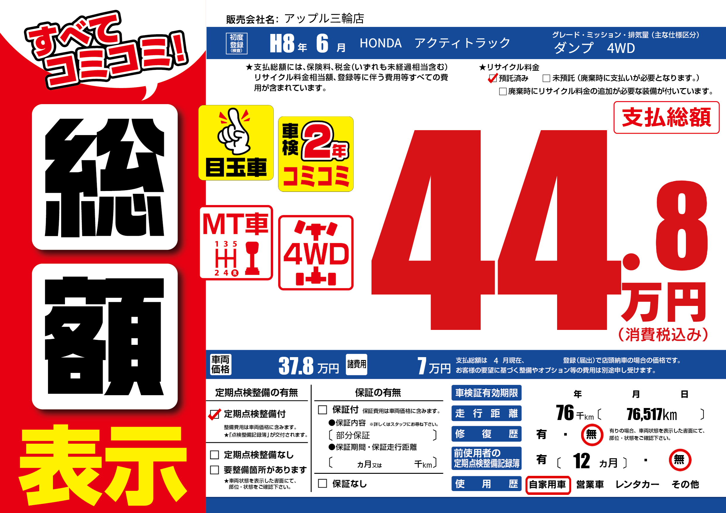 | 走行キロ | 7.6万km | 初年度登録 | H8年6月 |