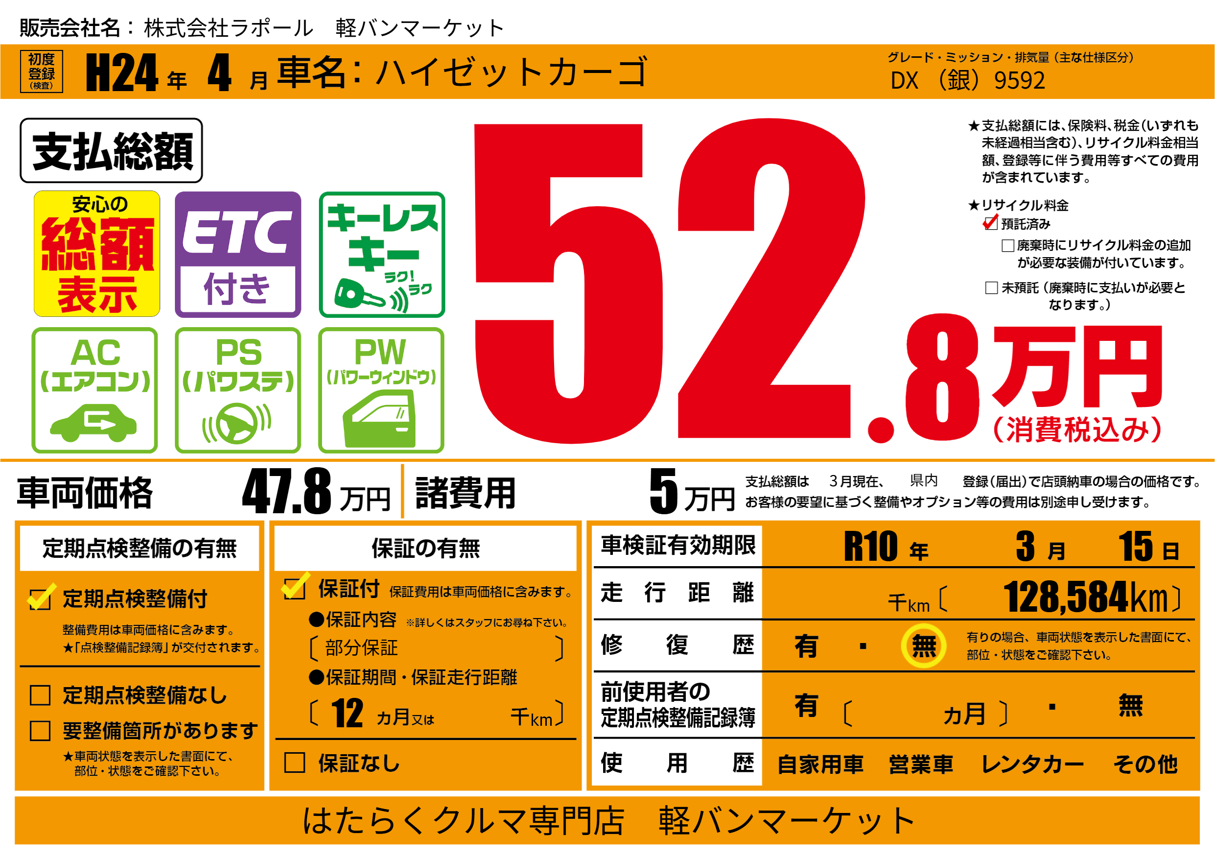 | 車名 | ハイゼットカーゴ | グレード ミッション 排気量 |