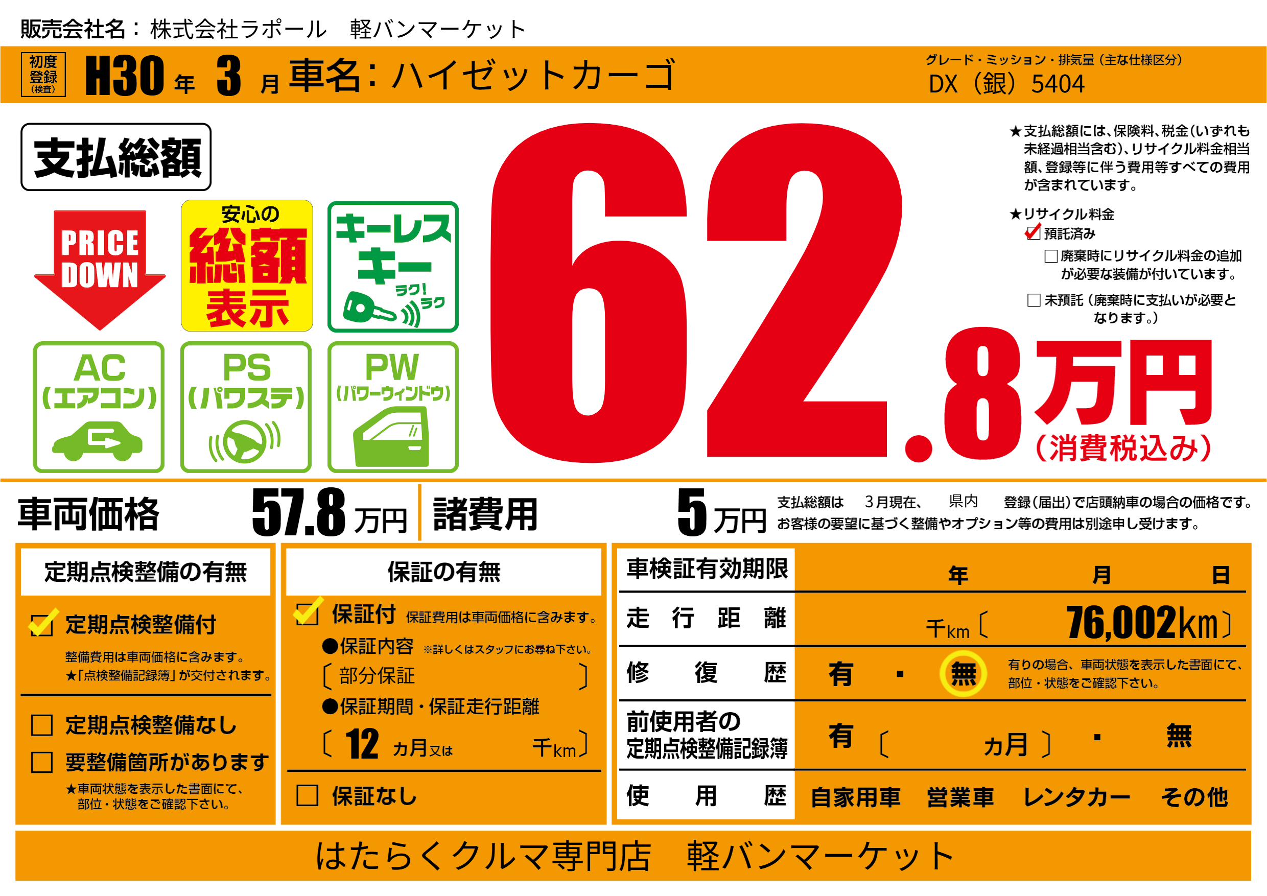 保証付き 保証内容(部分保証) 12ヶ月または()千kmまで |