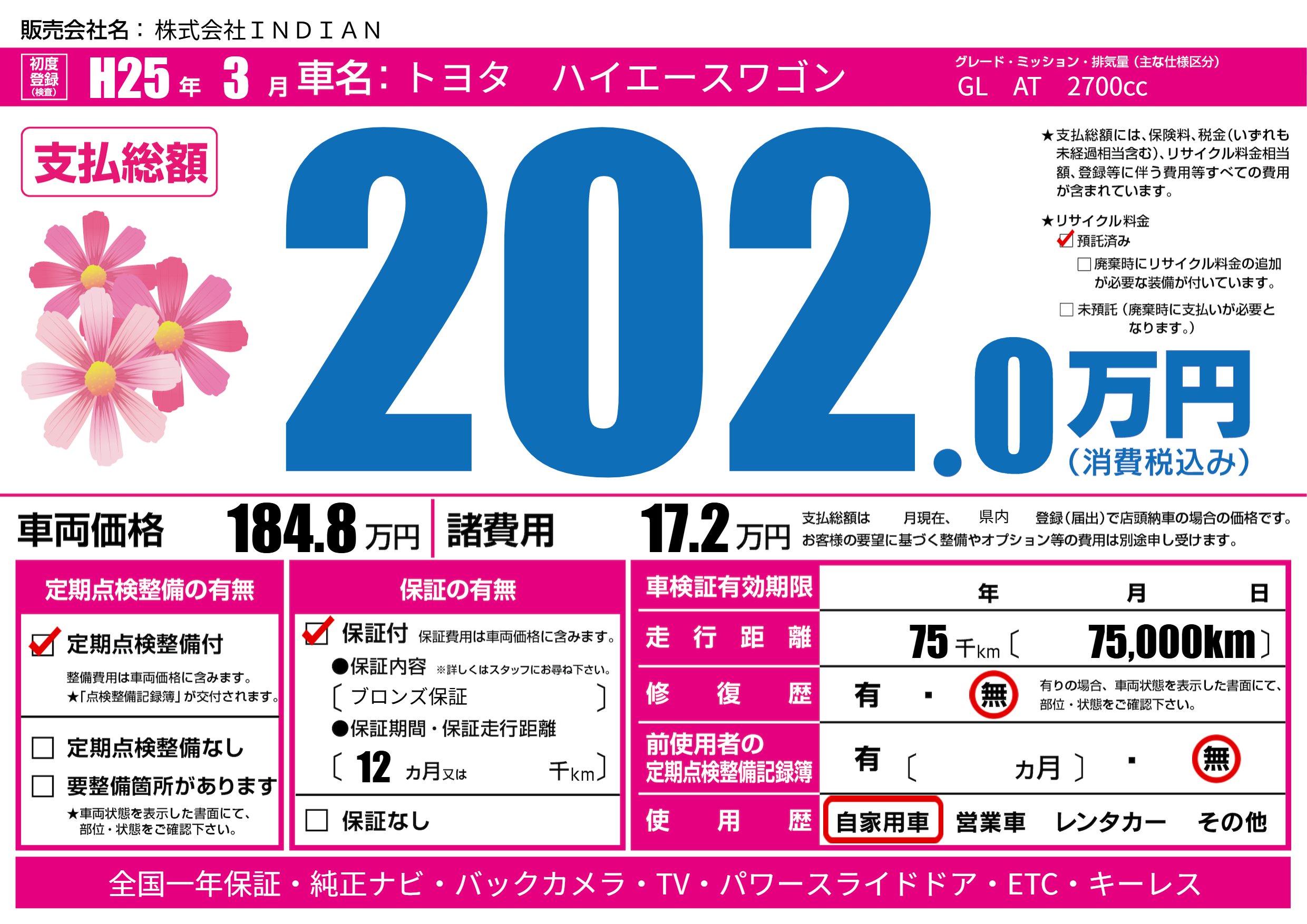 | 車名 | トヨタ ハイエースワゴン | グレード ミッション 排気量 |