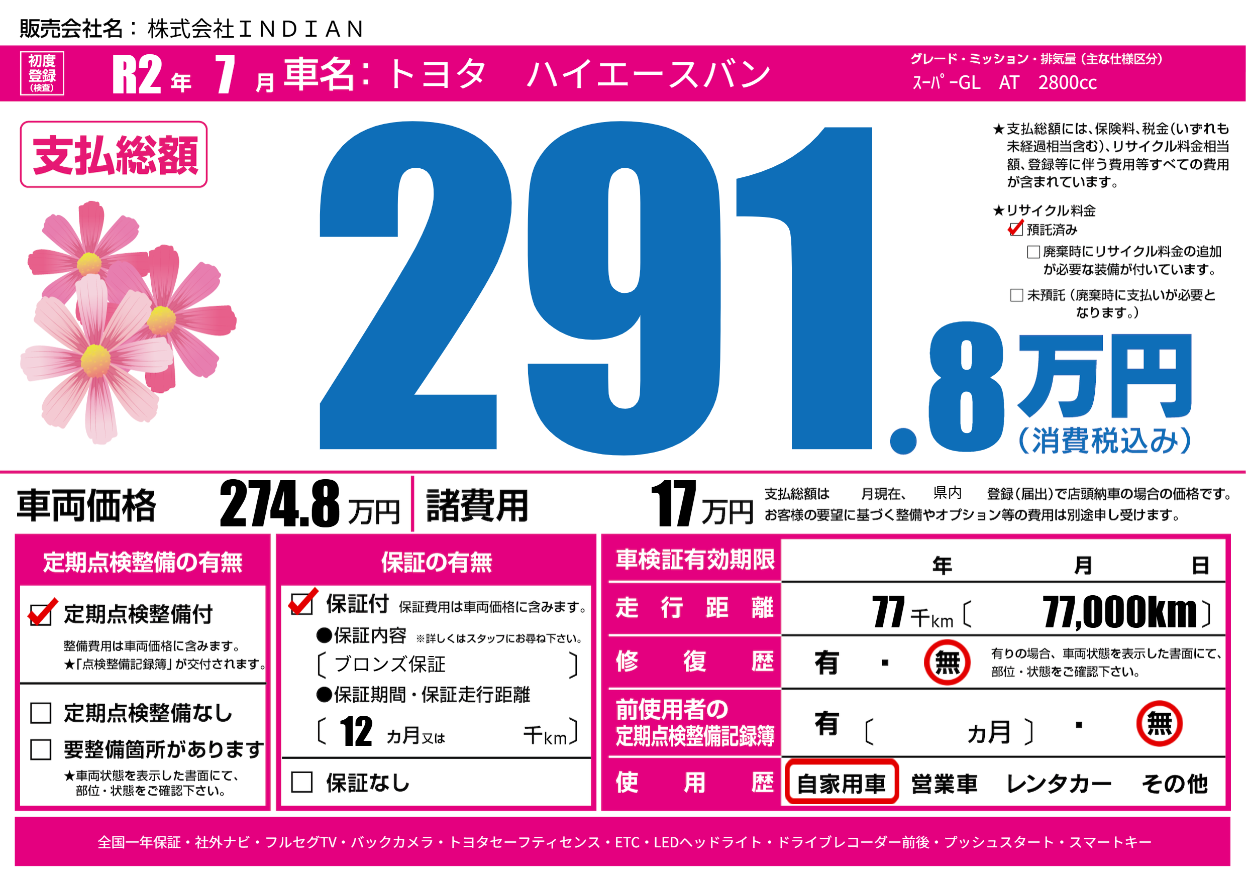 | 車名 | トヨタ ハイエースバン | グレード ミッション 排気量 |