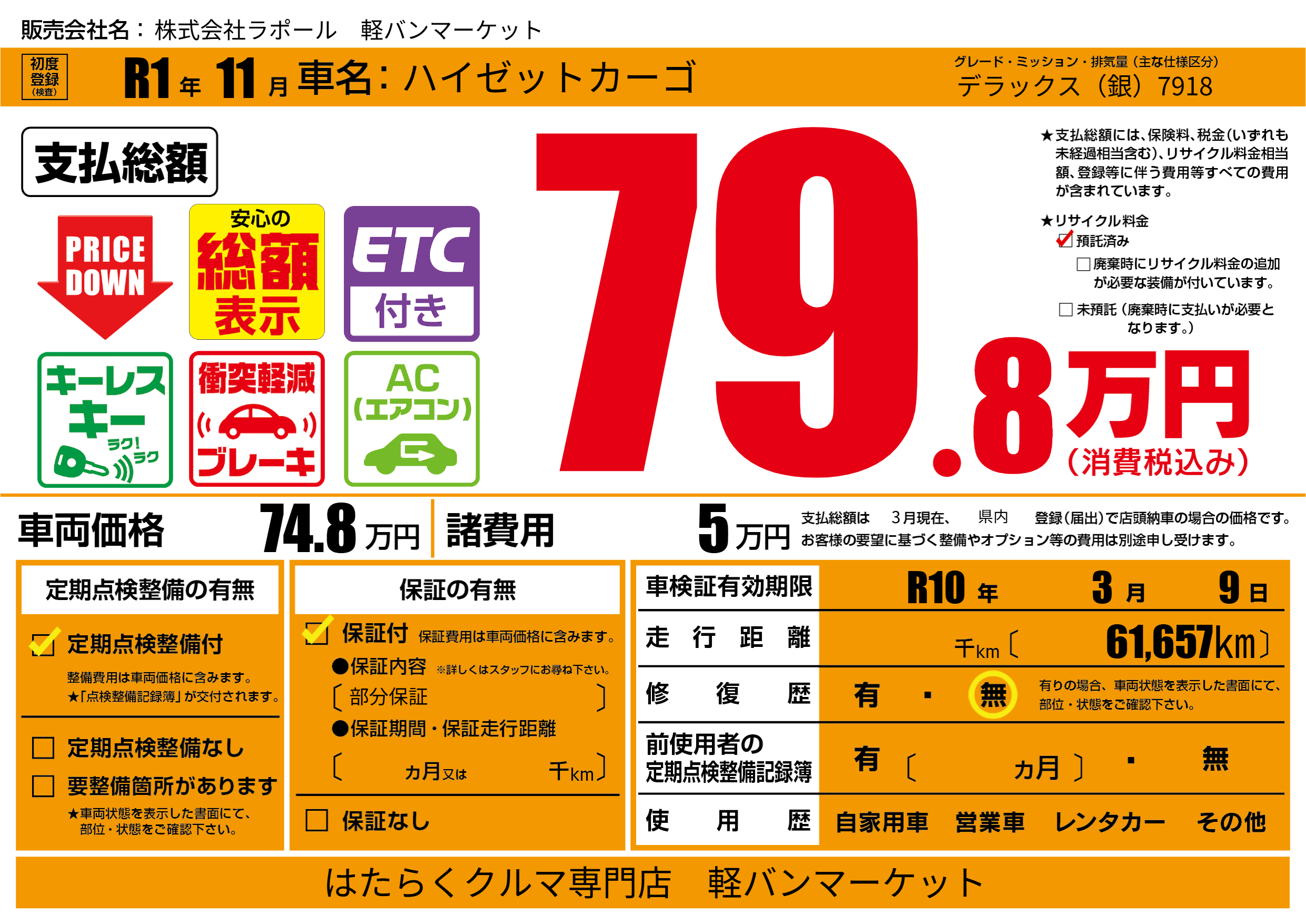 | 車名 | ハイゼットカーゴ | グレード ミッション 排気量 |