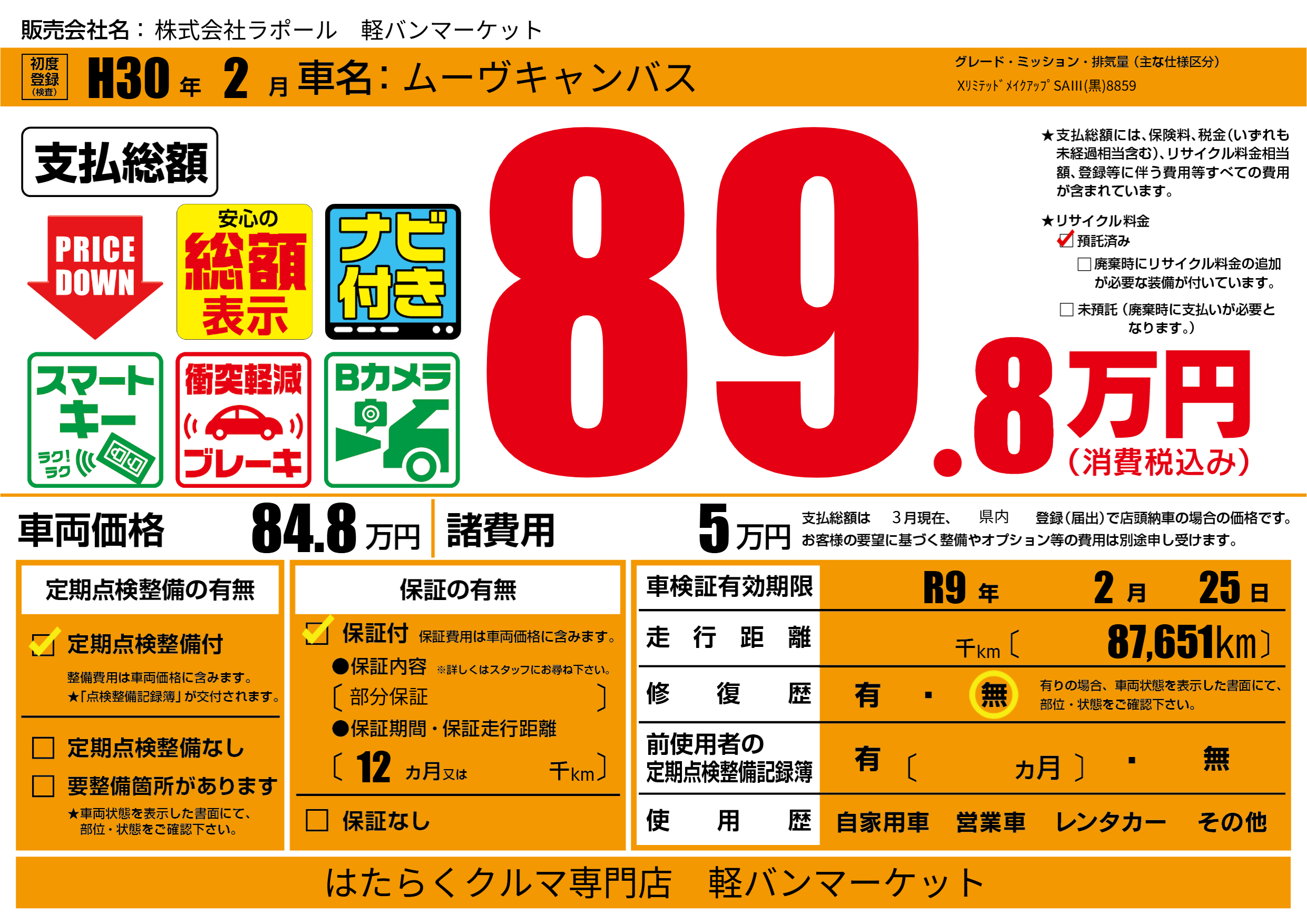 | 走行キロ | - | 初年度登録 | H30年2月 |