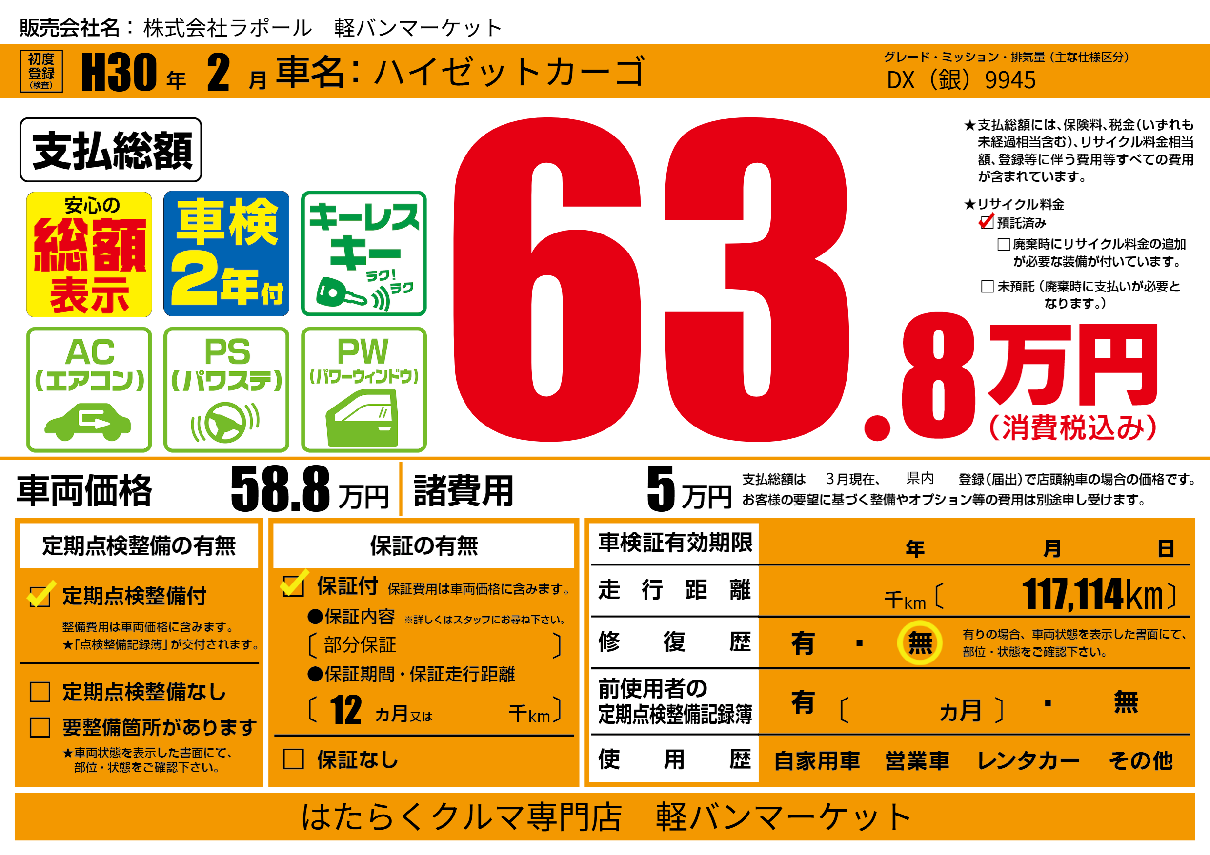 | 車名 | ハイゼットカーゴ | グレード ミッション 排気量 |