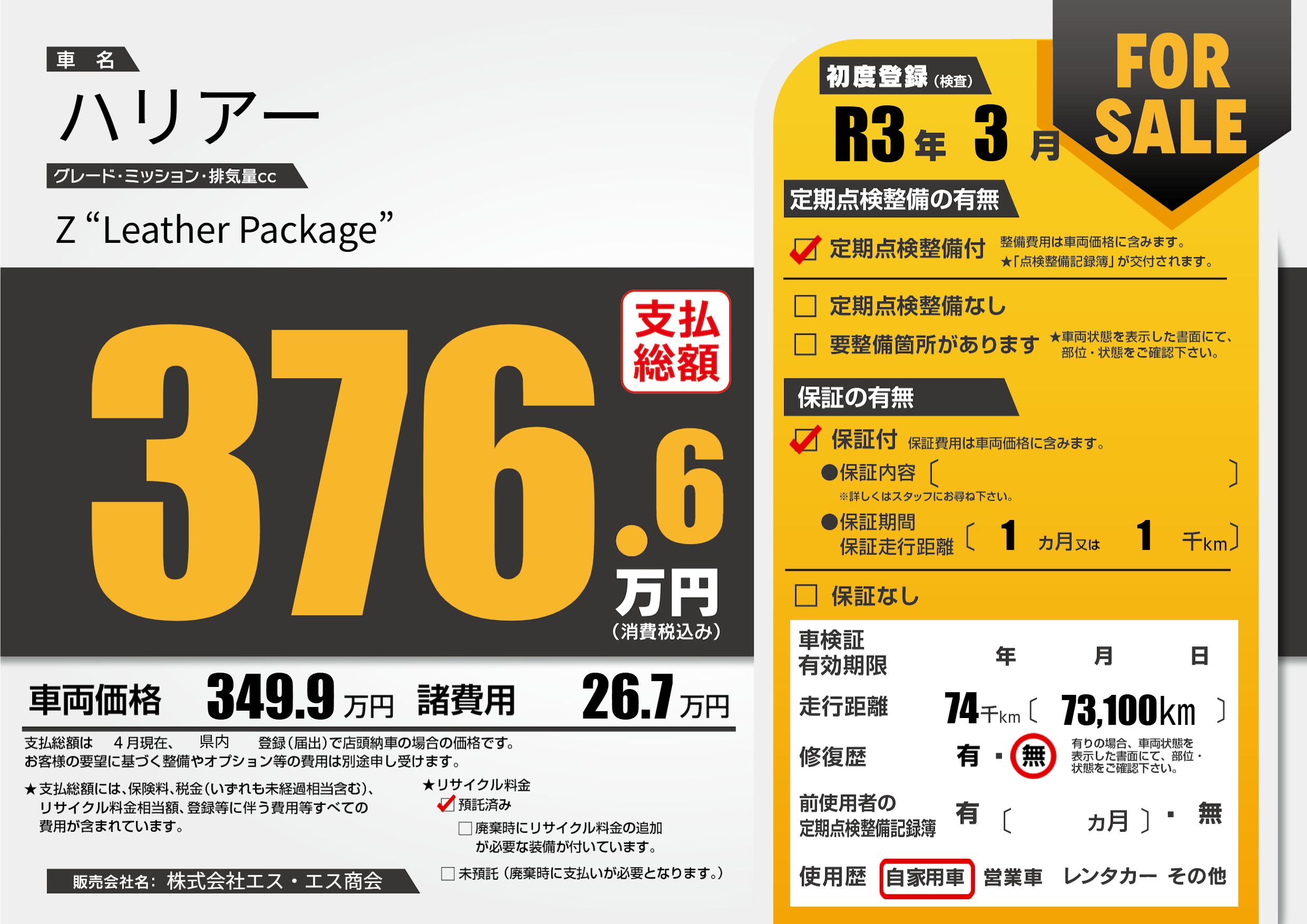 | 走行キロ | 7.4万km | 初年度登録 | R3年3月 |
