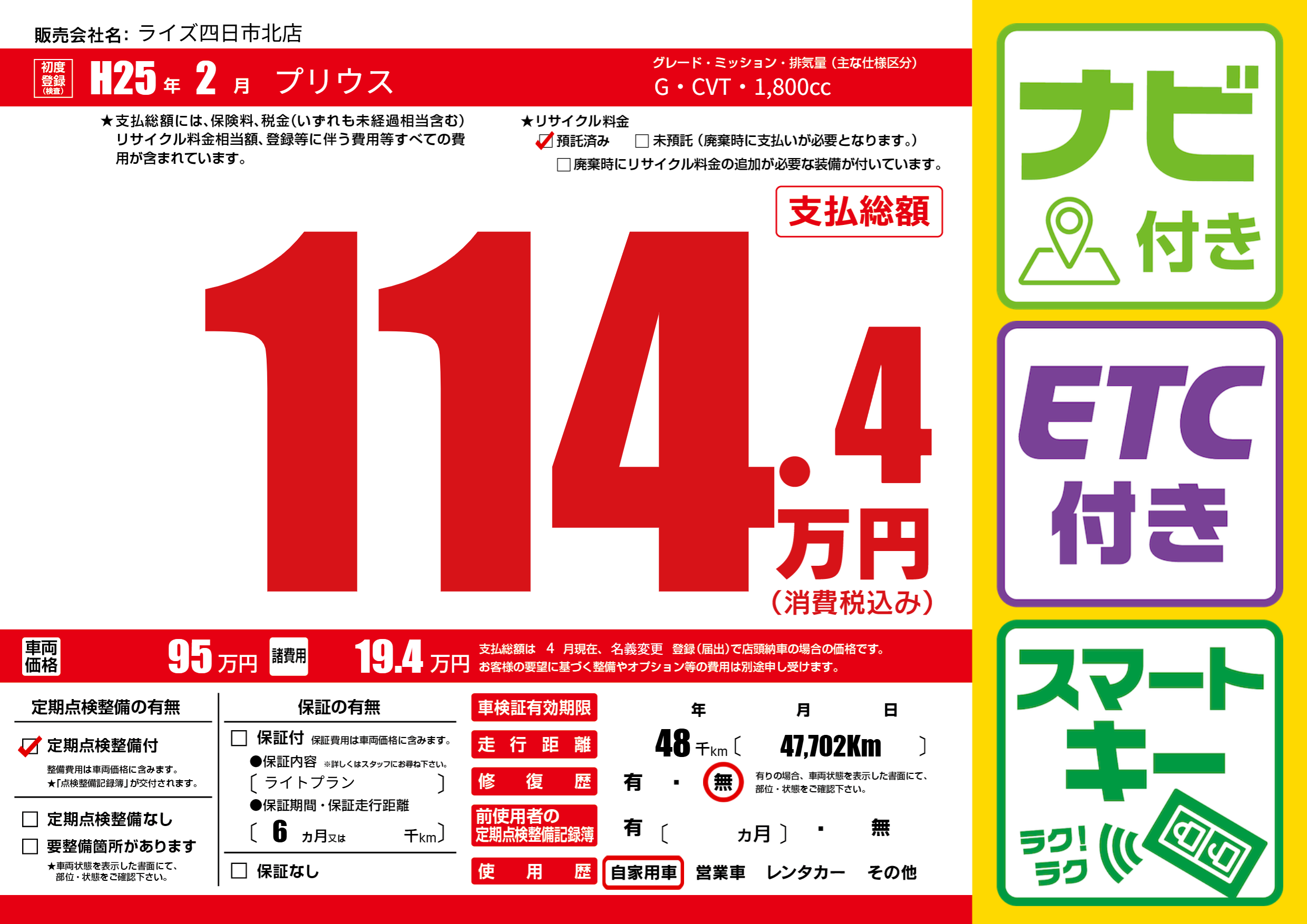 | 走行キロ | 4.8万km | 初年度登録 | H25年2月 |