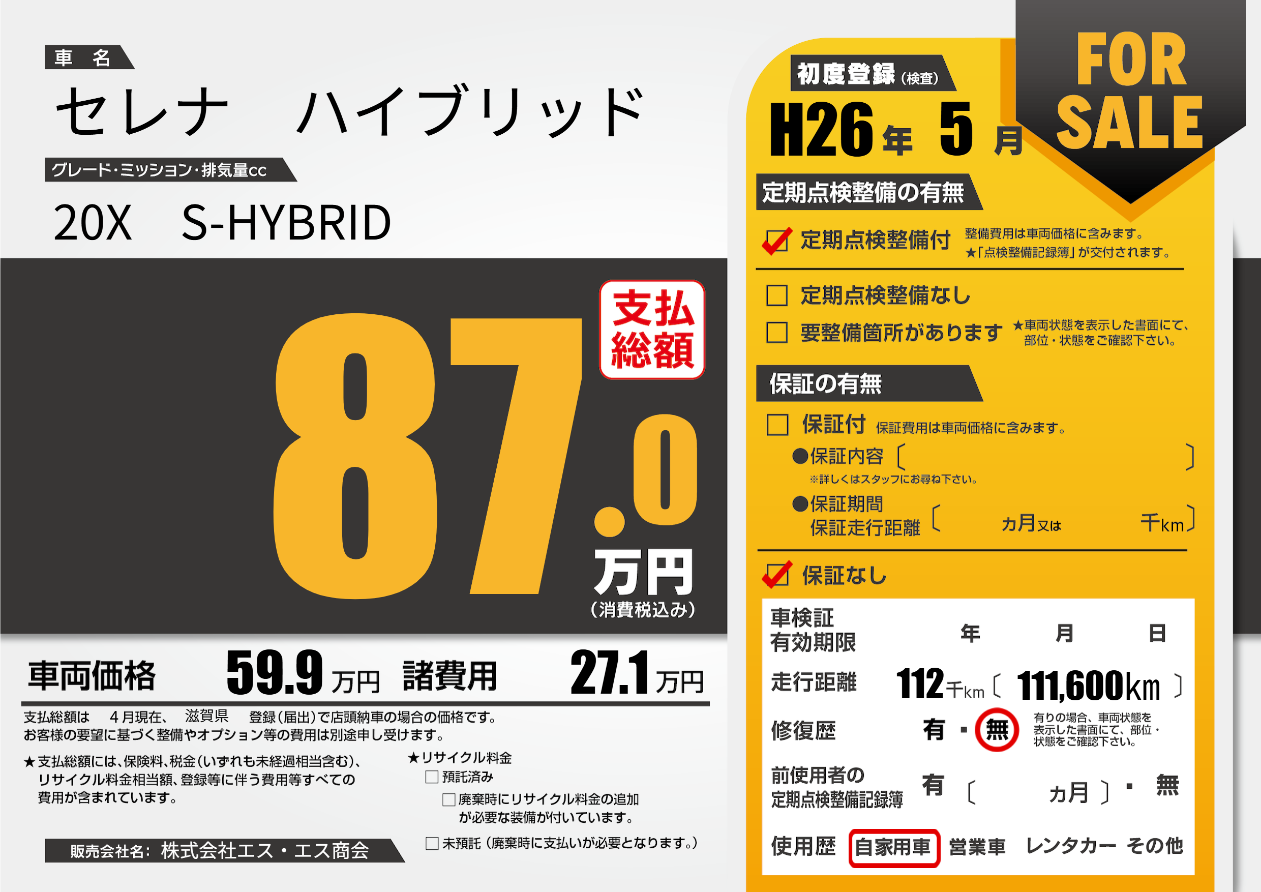 | 走行キロ | 11.2万km | 初年度登録 | H26年5月 |