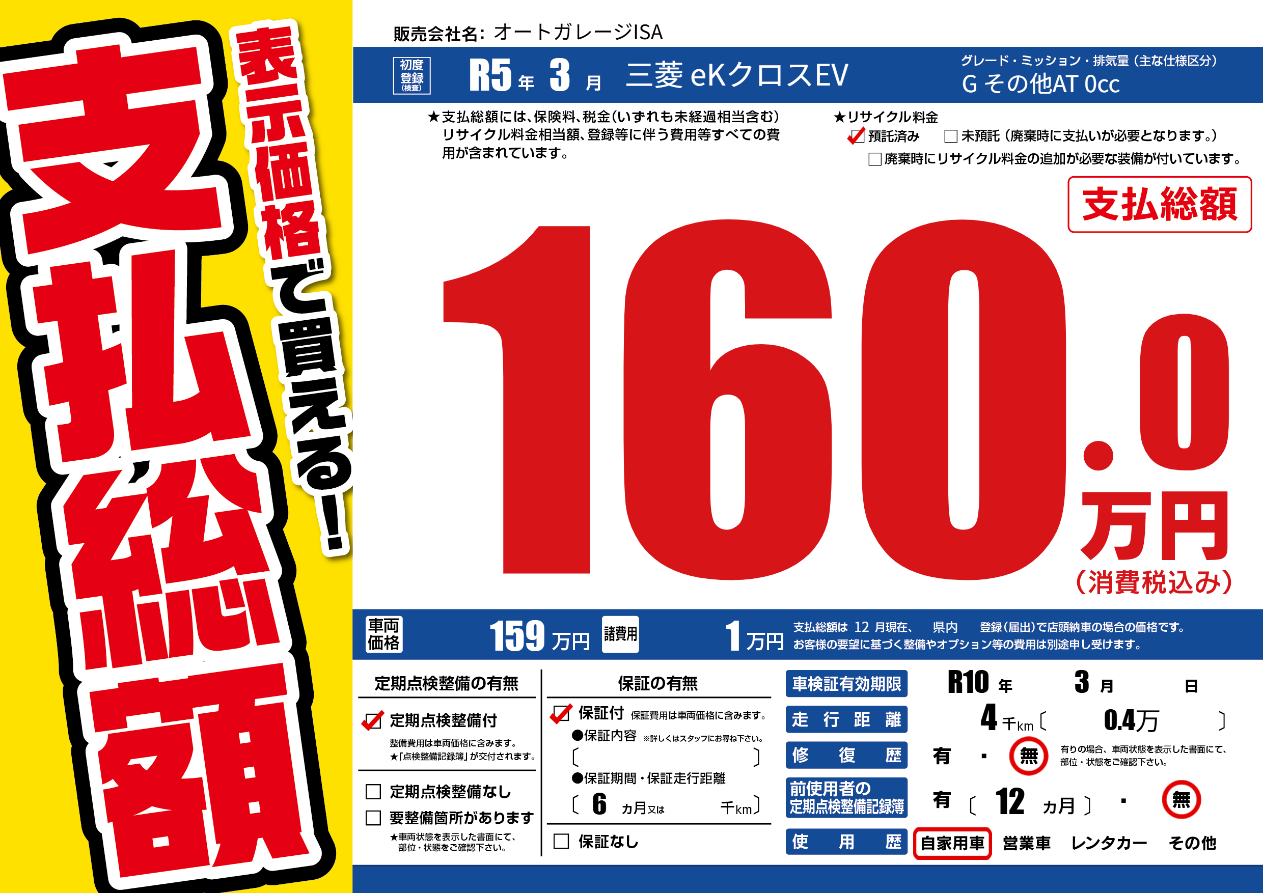 | 走行キロ | 0.4万km | 初年度登録 | R5年3月 |