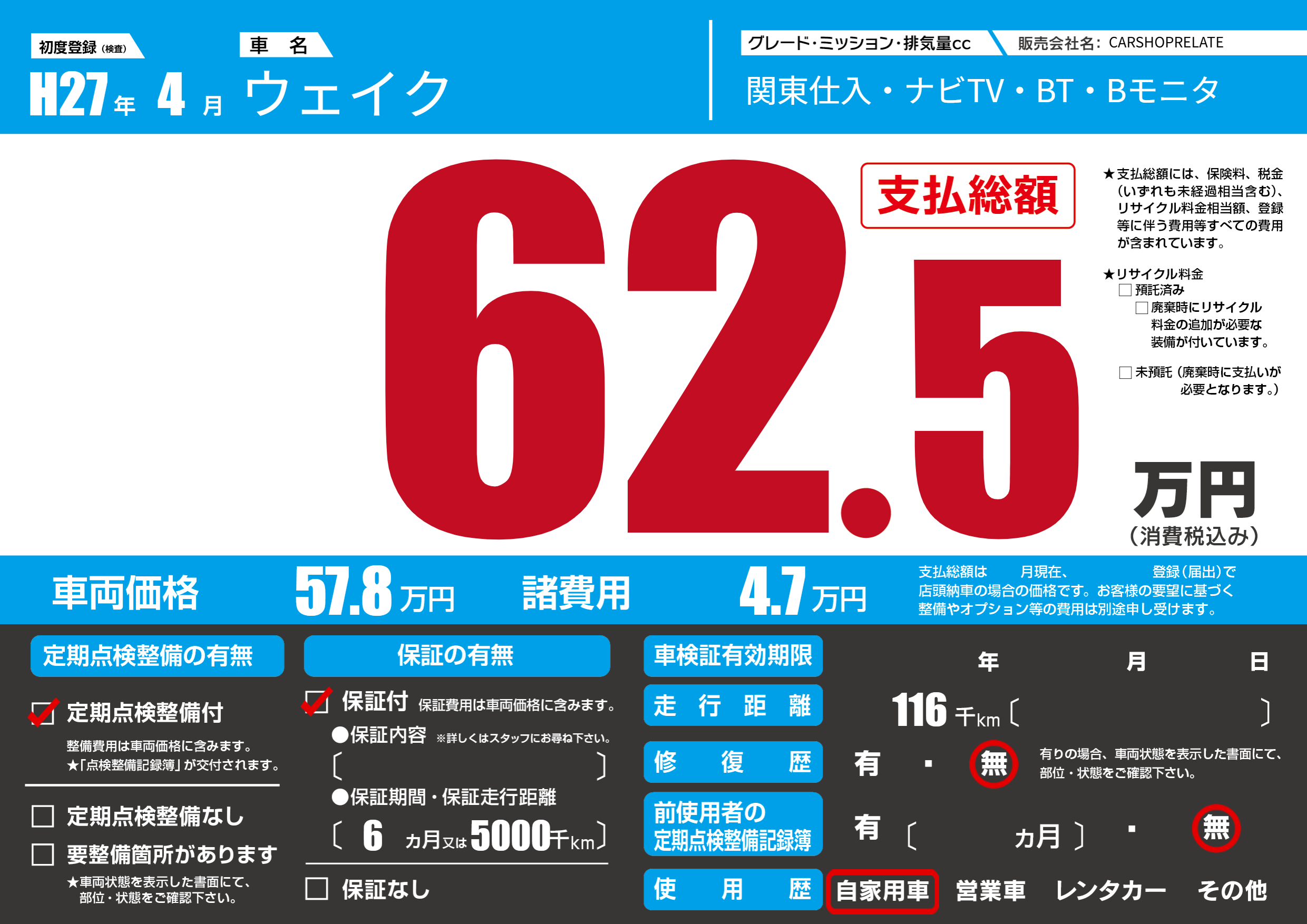 | 走行キロ | 11.6万km | 初年度登録 | H27年4月 |
