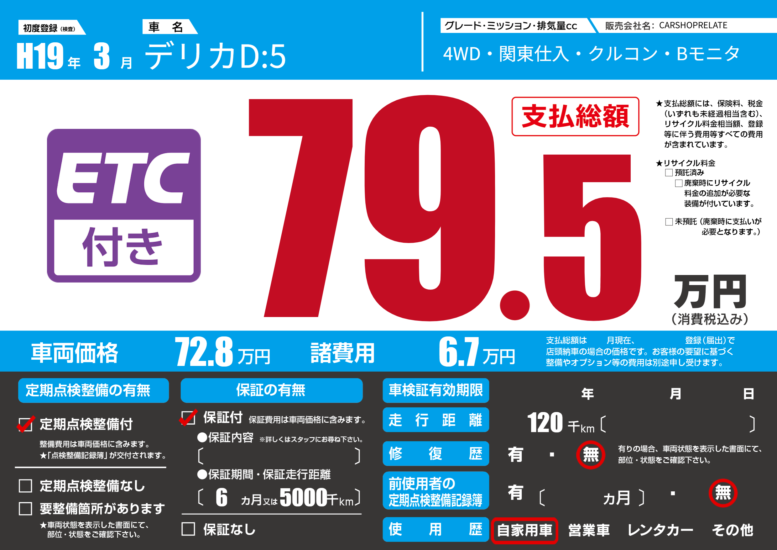 | 車名 | デリカD:5 | グレード ミッション 排気量 |