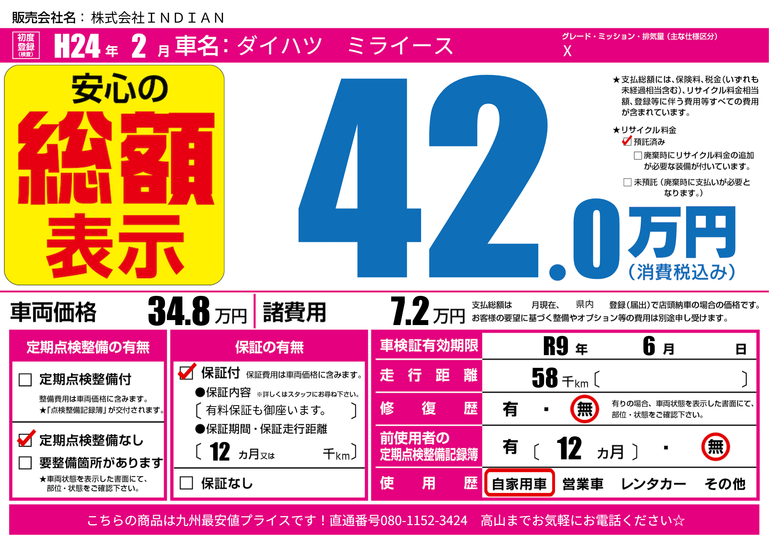 | 走行キロ | 5.8万km | 初年度登録 | H24年2月 |
