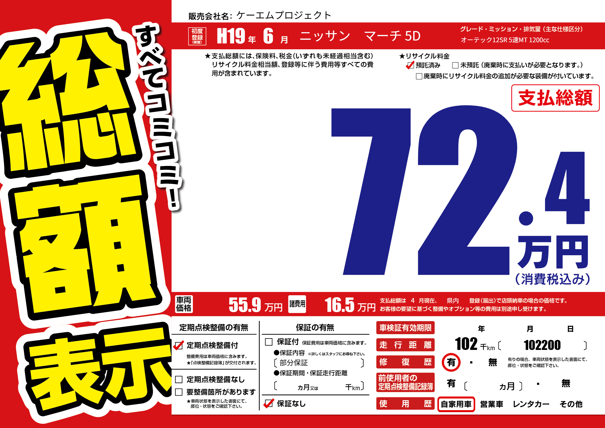 | 車名 | ニッサン マーチ 5D | グレード ミッション 排気量 |
