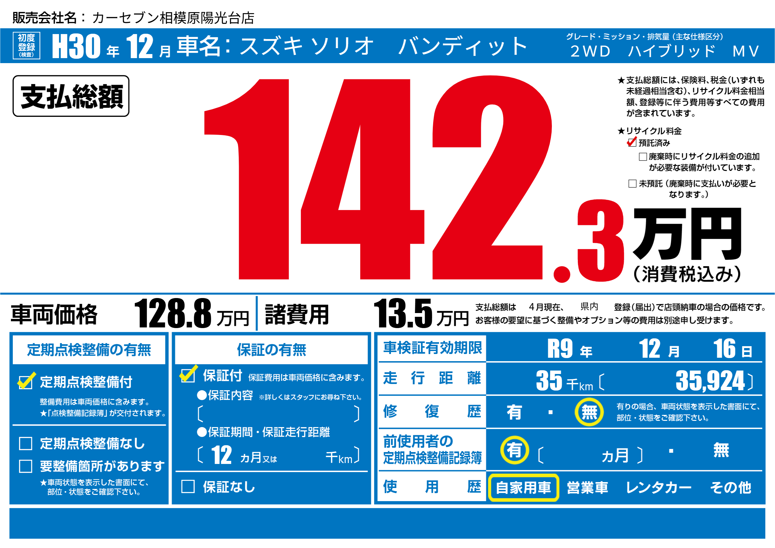 なし | 車検制限 | R9年12月16月 |