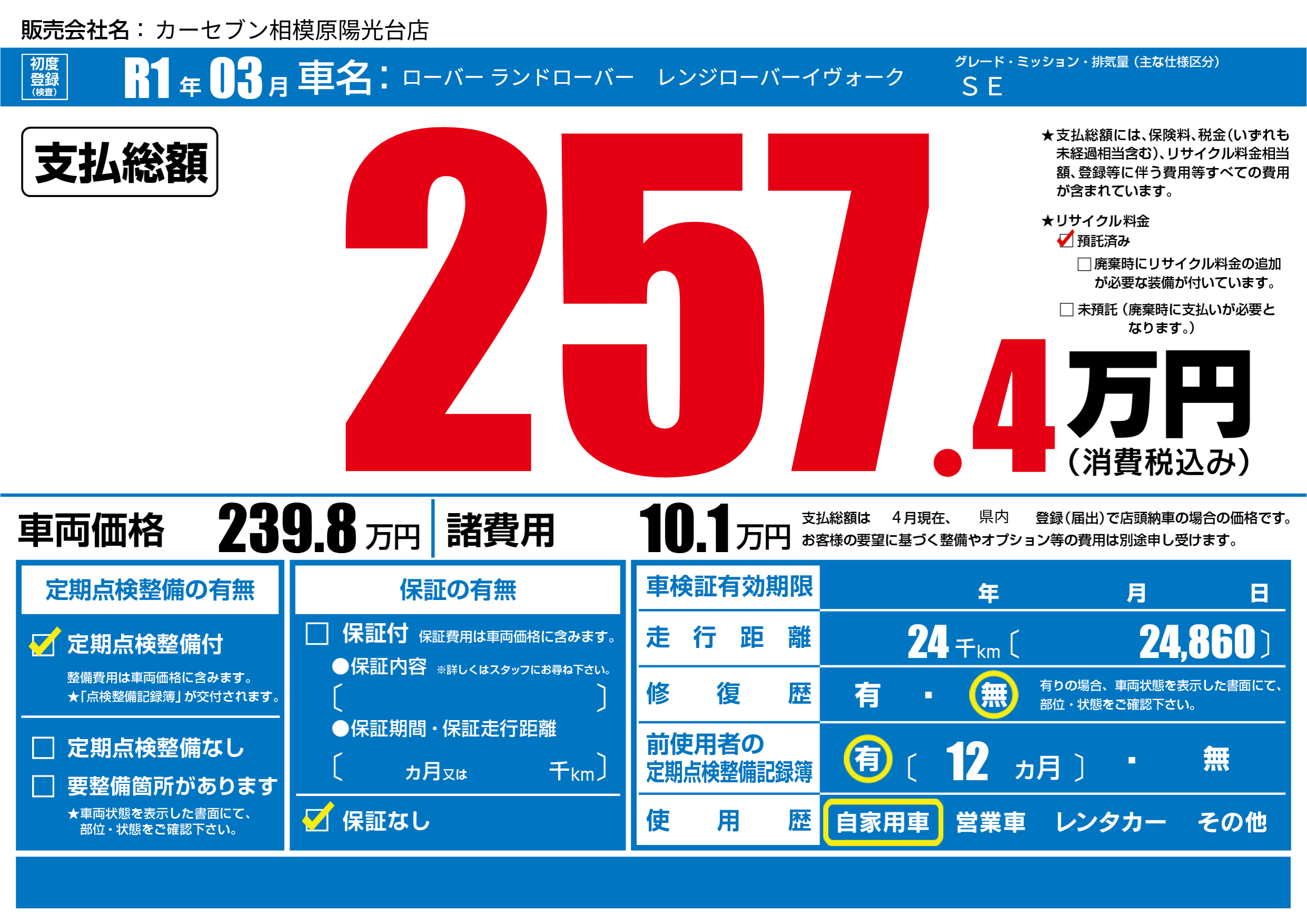| 走行キロ | 2.4万km | 初年度登録 | R1年03月 |
