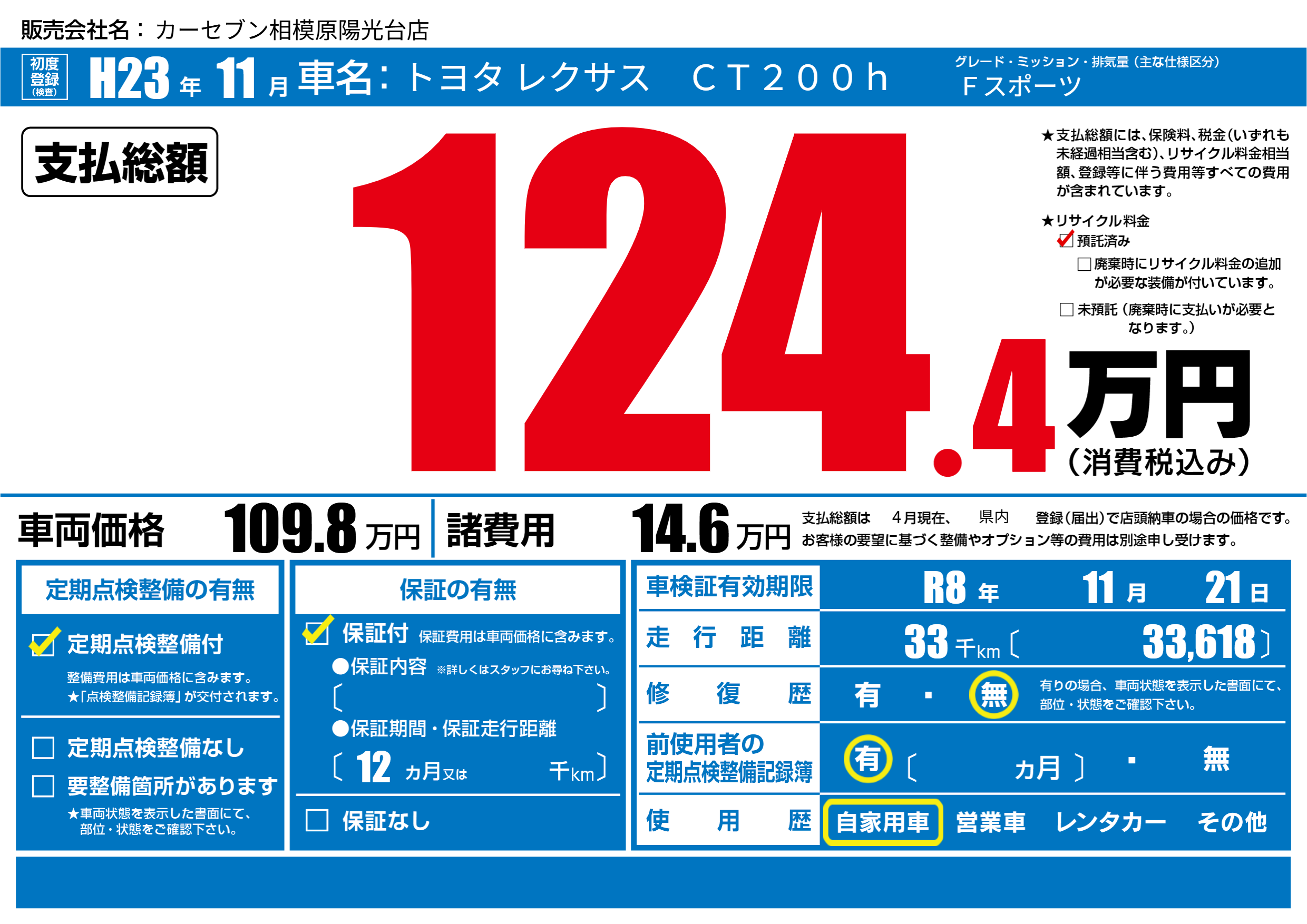 | 車名 | トヨタ レクサス CT200h | グレード ミッション 排気量 |