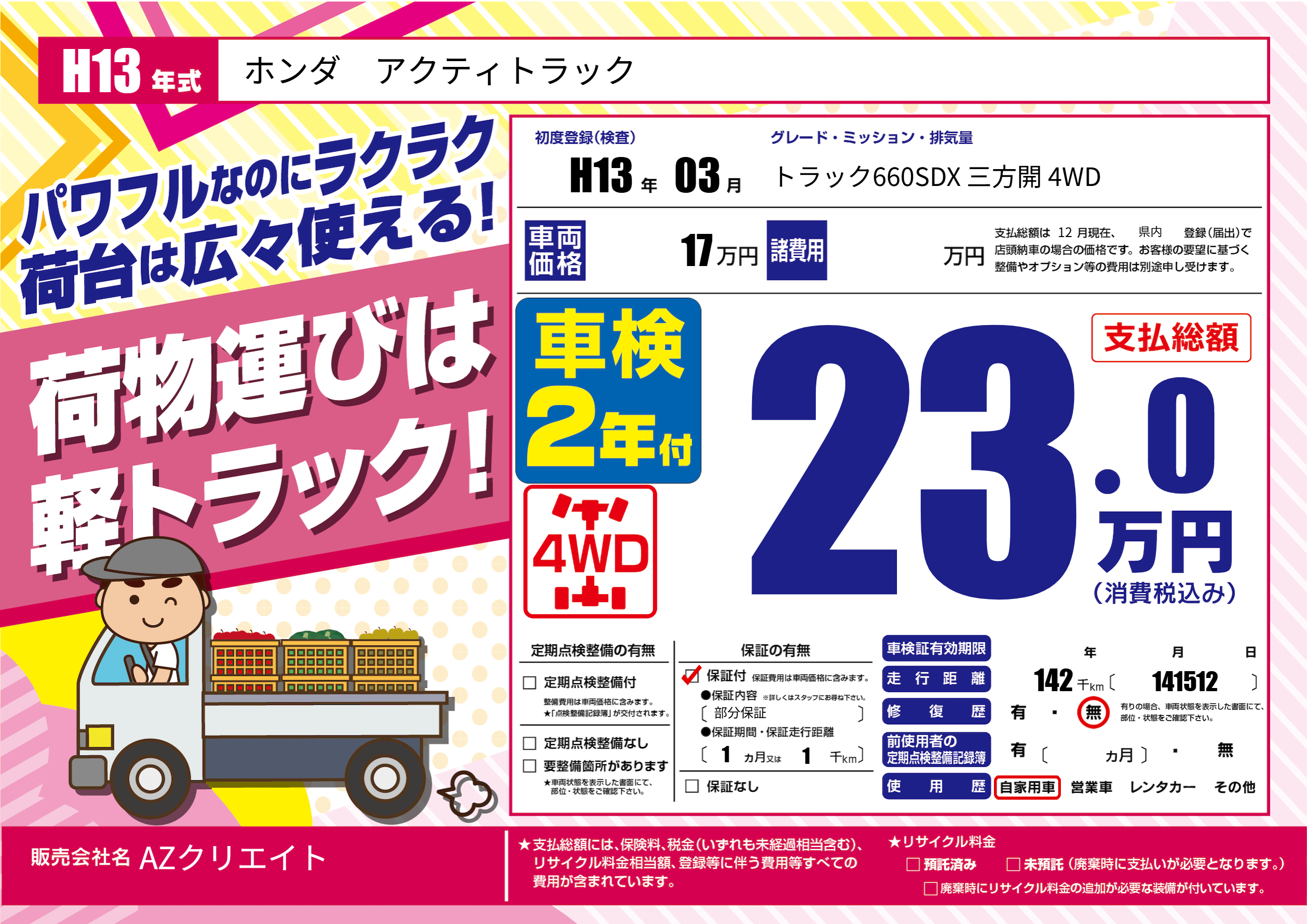| 走行キロ | 14.2万km | 初年度登録 | H13年03月 |