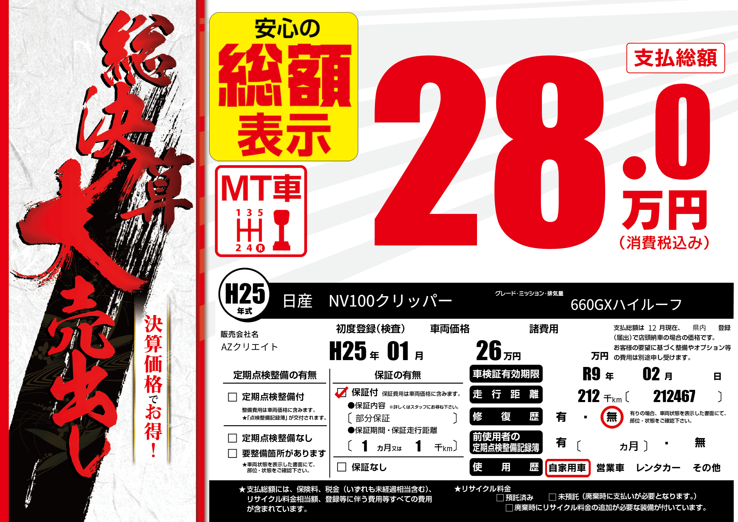 | 車名 | 日産 NV100クリッパー | グレード ミッション 排気量 |