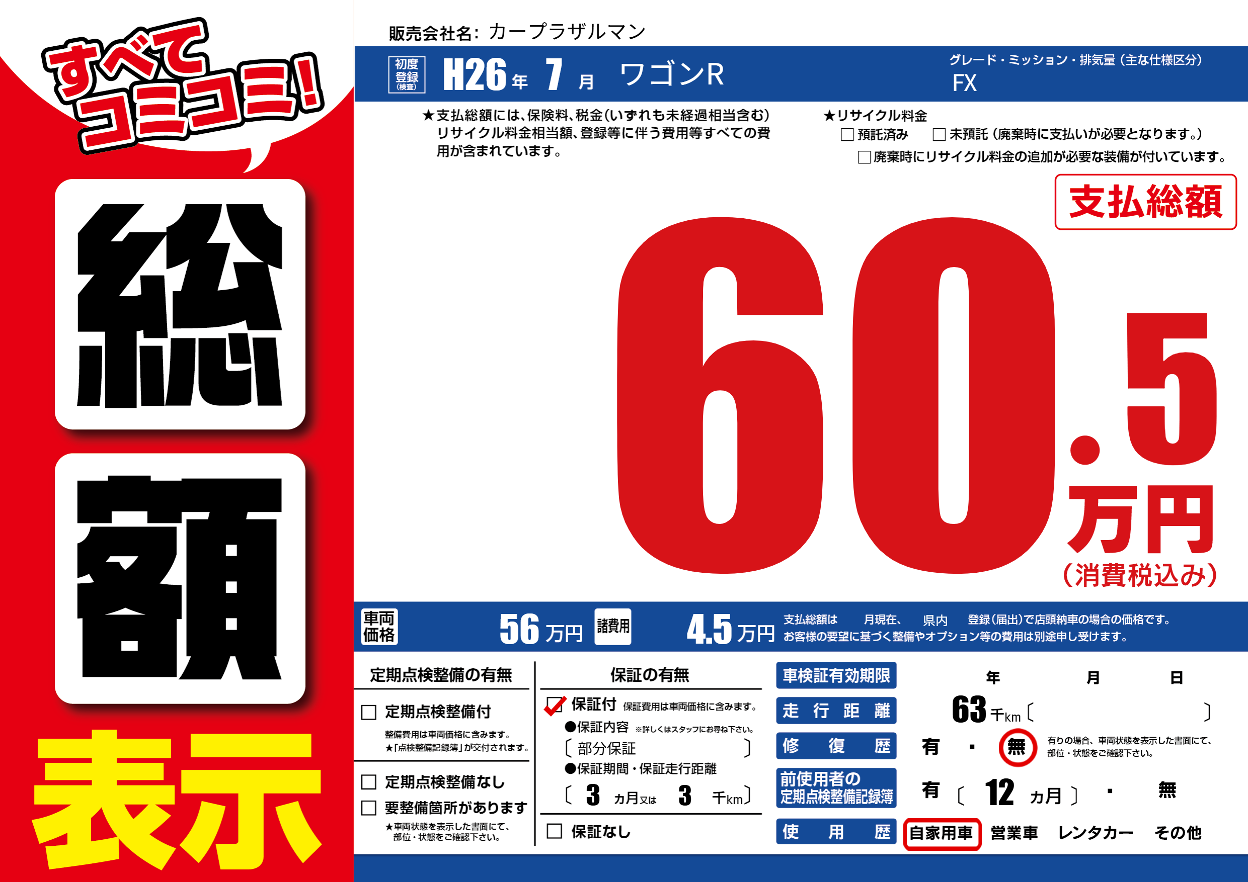 | 車名 | ワゴンR | グレード ミッション 排気量 |