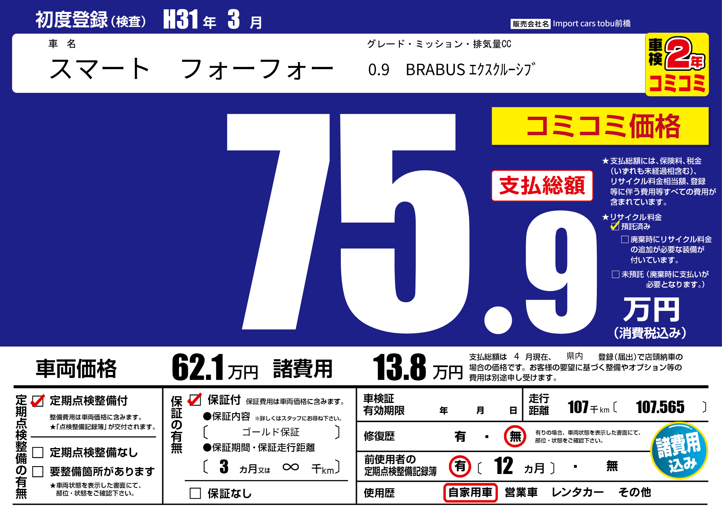 | 車名 | スマート フォーフォー | グレード ミッション 排気量 |