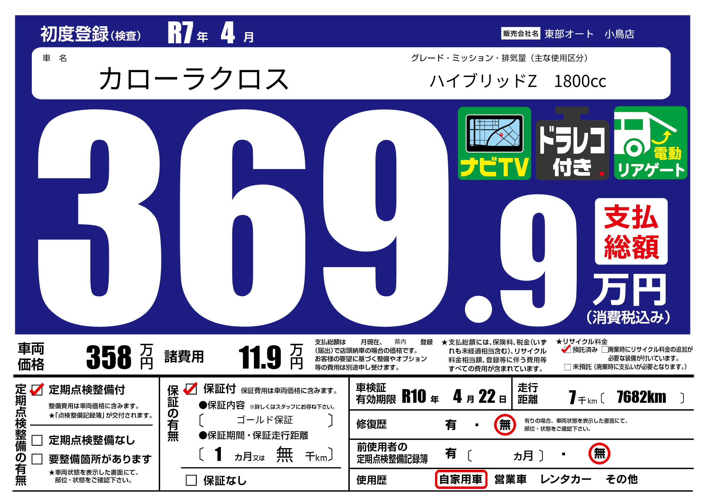 | 車名 | カローラクロス | グレード ミッション 排気量 |