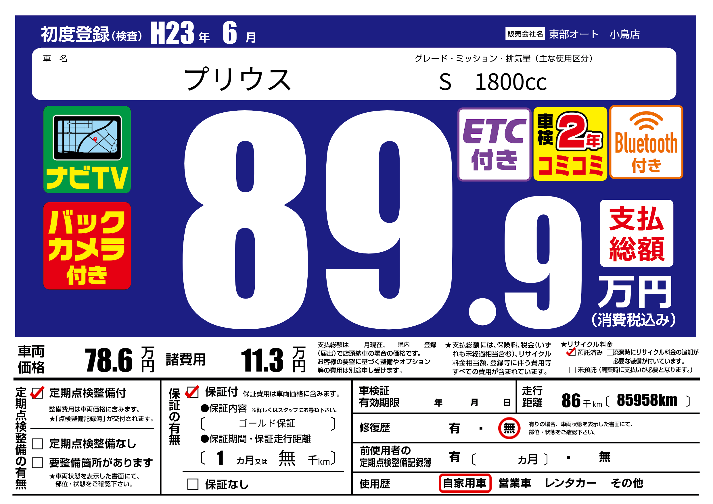 | 車名 | プリウス | グレード ミッション 排気量 |