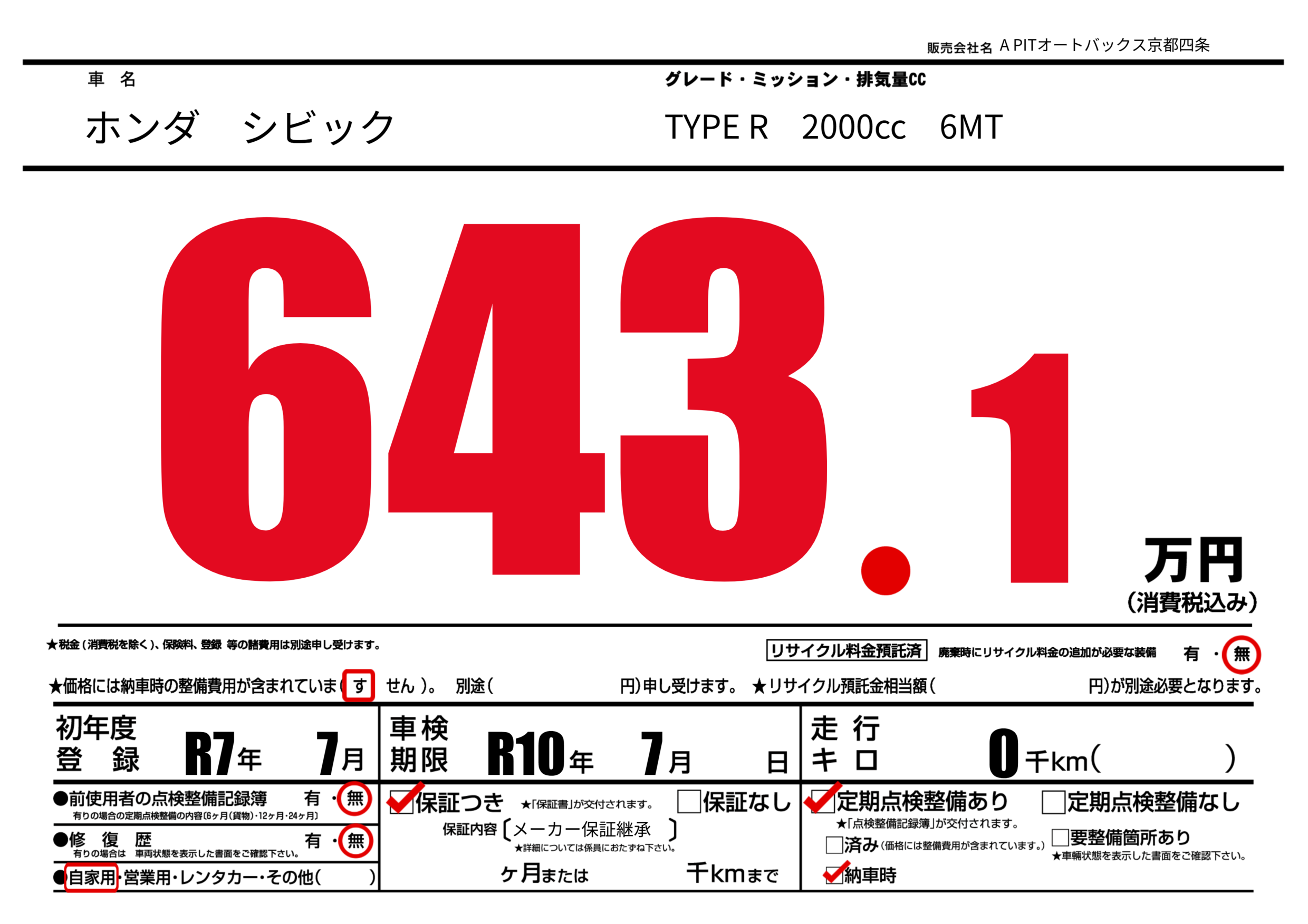 | 車検制限 | R10年 7月 - 日 | ||