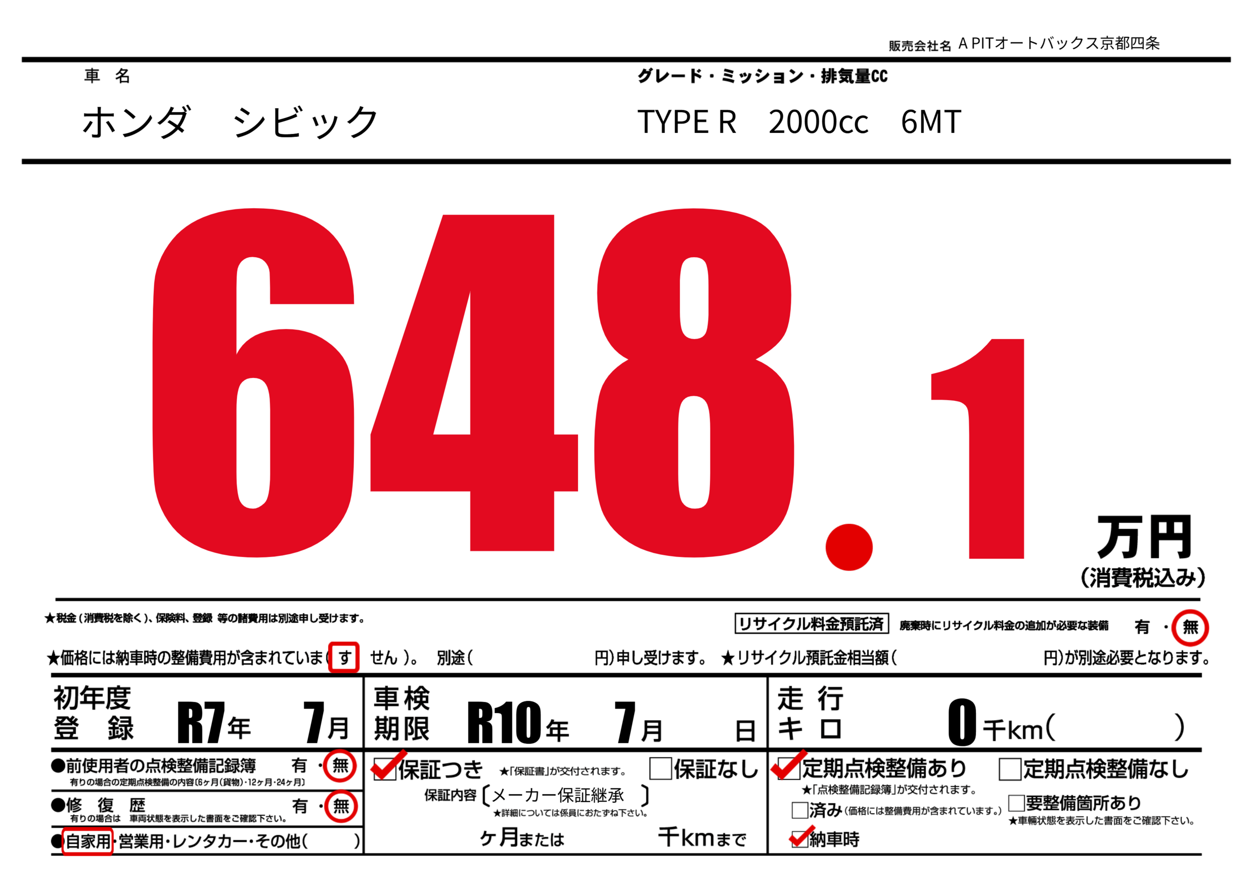 | 車検制限 | R10年 7月 - 日 | ||