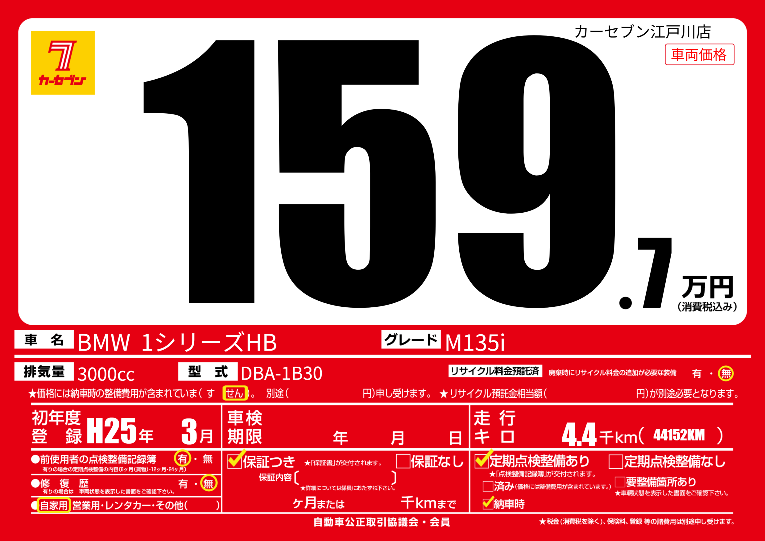 | 定期点検整備 | 定期点検整備あり 納車時あり | ||