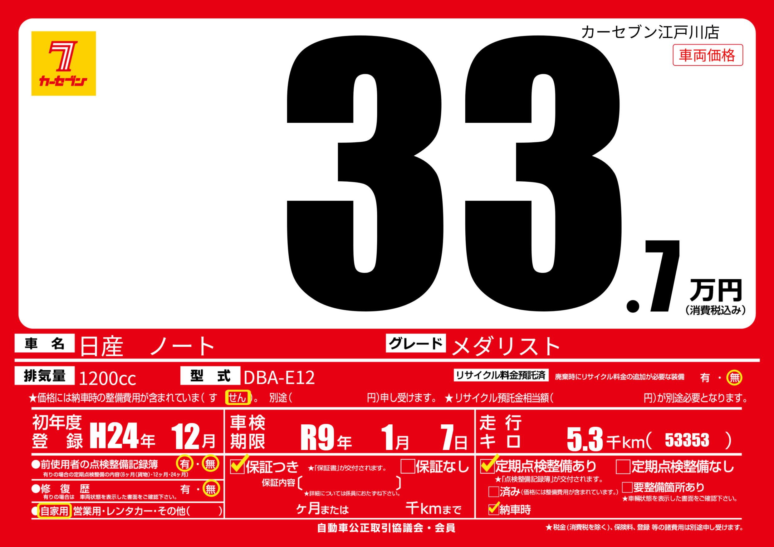 | 車名 | 日産 ノート | グレード ミッション 排気量 |