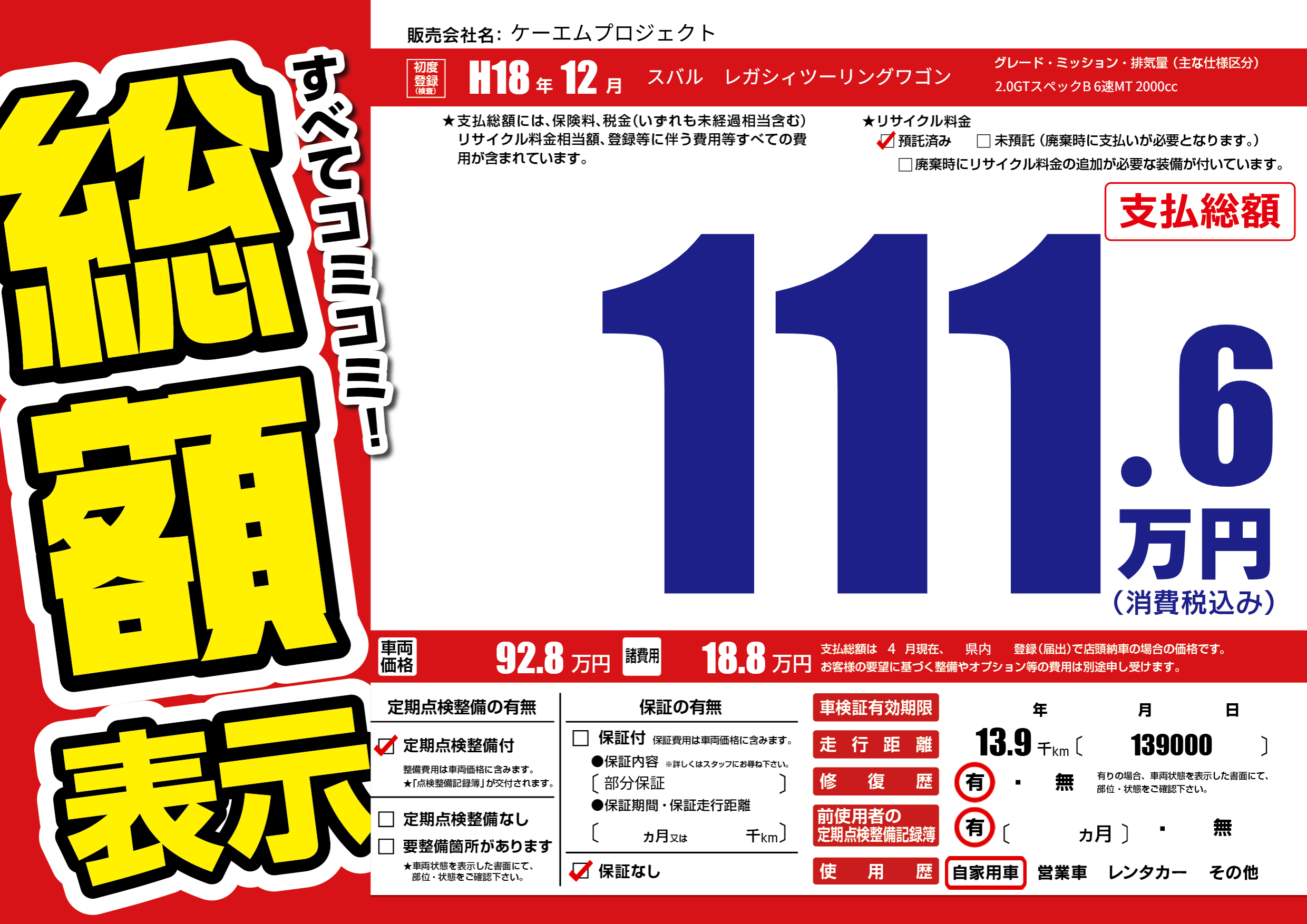 | 車名 | スバル レガシィツーリングワゴン | グレード ミッション 排気量 |
