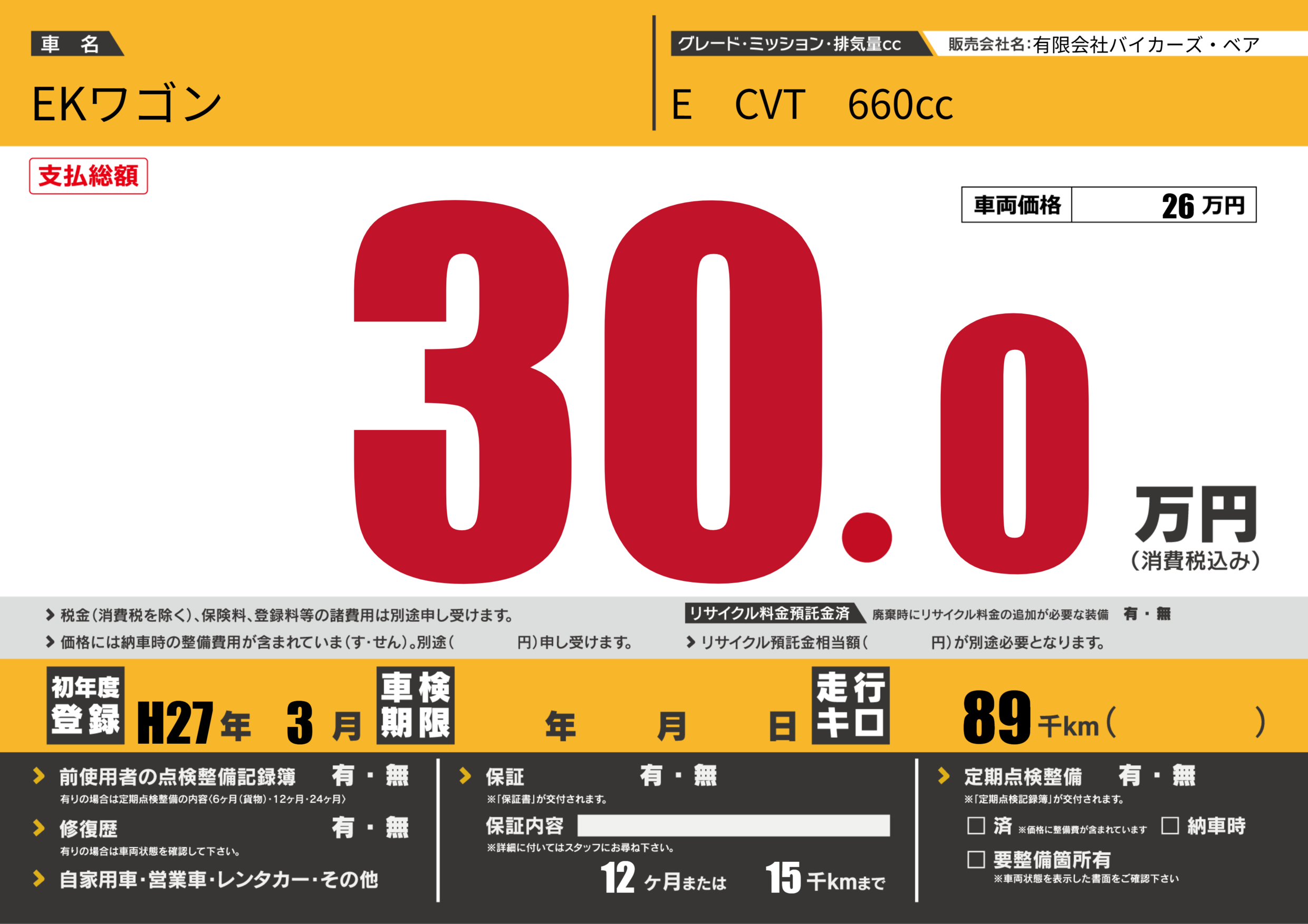 | 車名 | EKワゴン | グレード ミッション 排気量 |