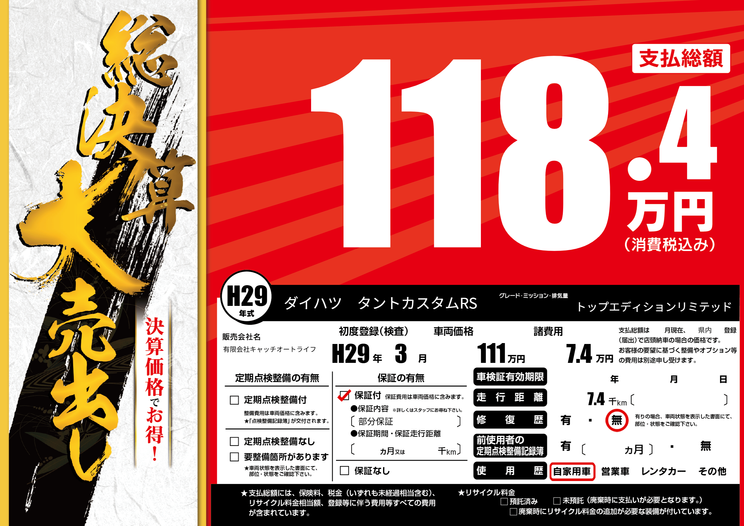保証付き 保証内容(部分保証) ---ヶ月または()千kmまで |