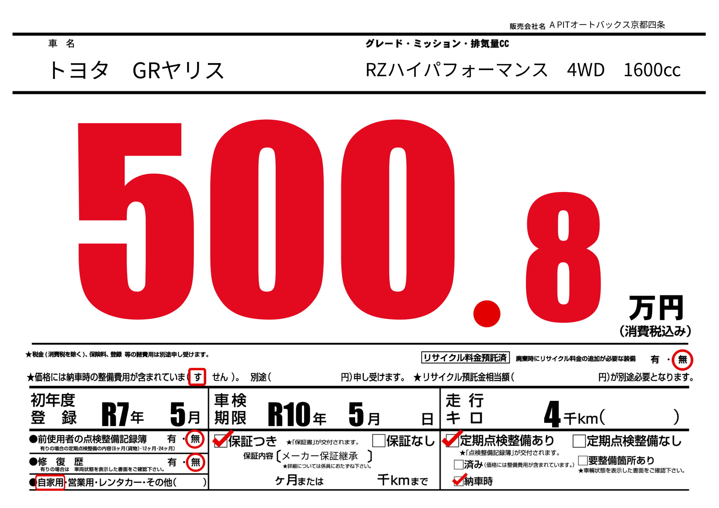 | 車名 | トヨタ GRヤリス | グレード ミッション 排気量 |