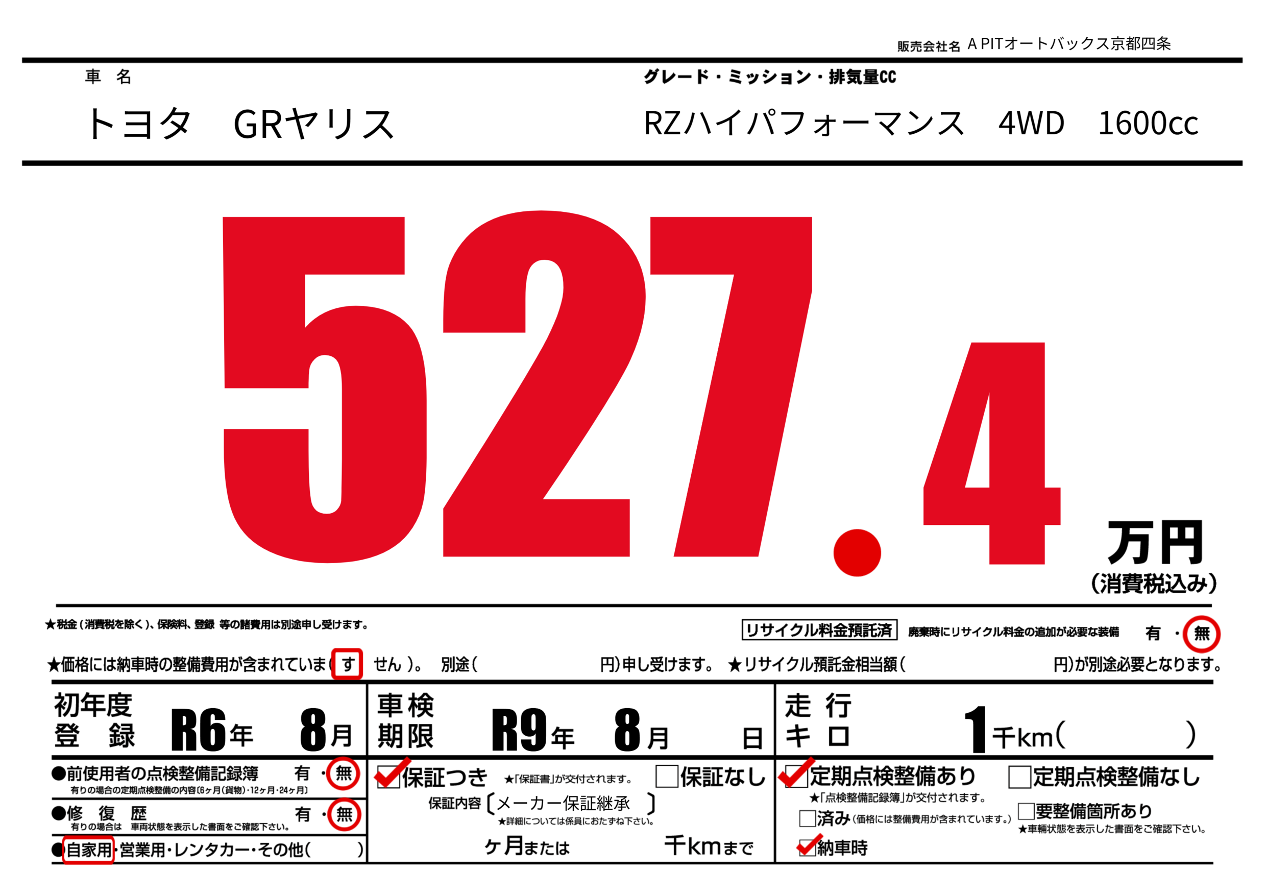 | 車名 | トヨタ GRヤリス | グレード ミッション 排気量 |