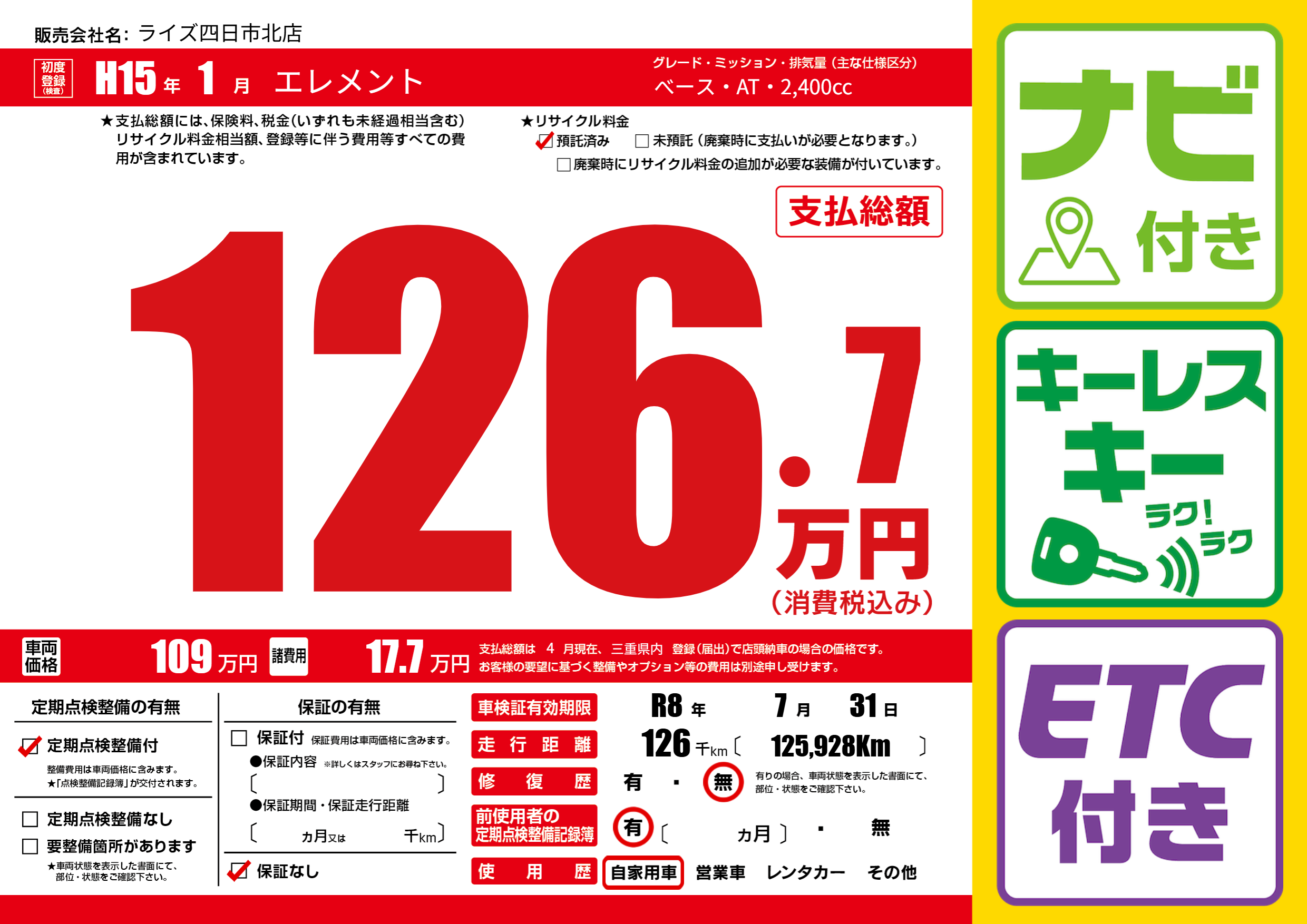 なし | 車検制限 | R8年7月31月 |