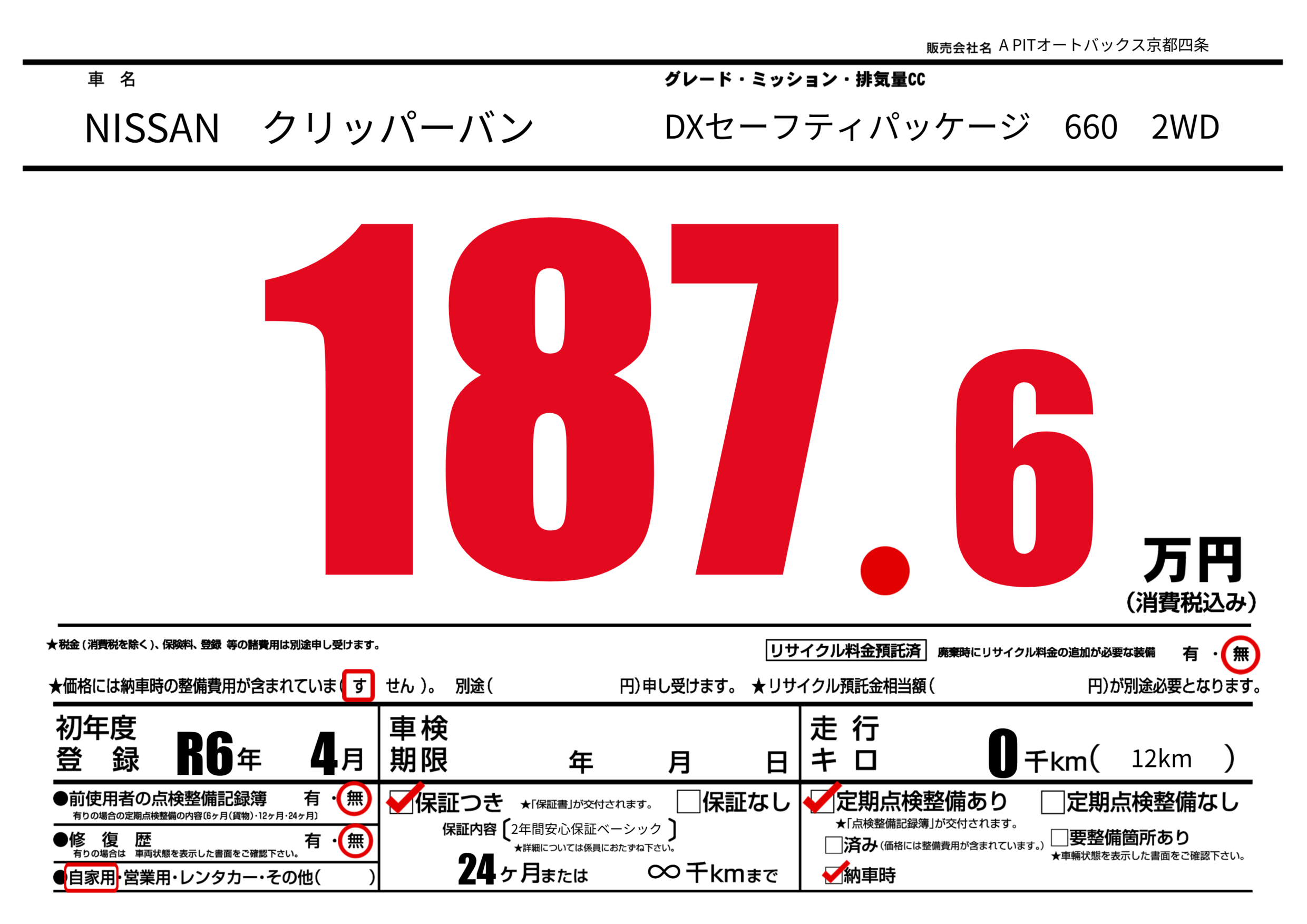 保証なし 保証内容(2年間安心保証ベーシック) 24ヶ月または(∞)千kmまで |