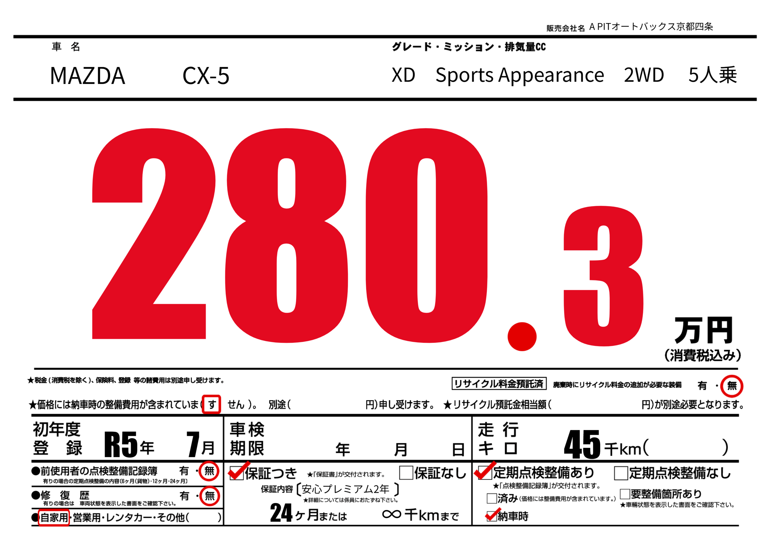 | 走行キロ | 4.5万km | 初年度登録 | R5年7月 |