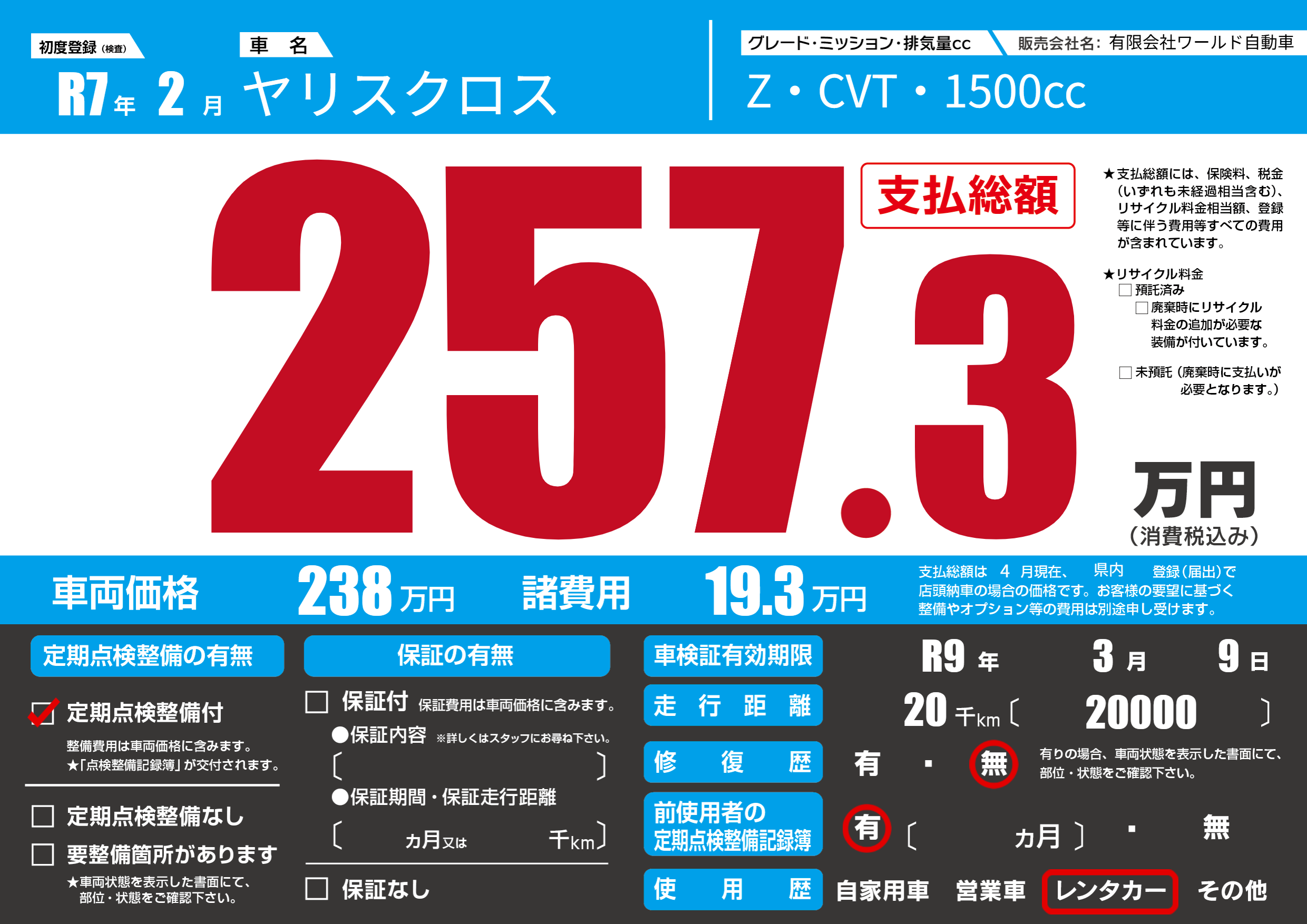 なし | 車検制限 | R9年3月9月 |
