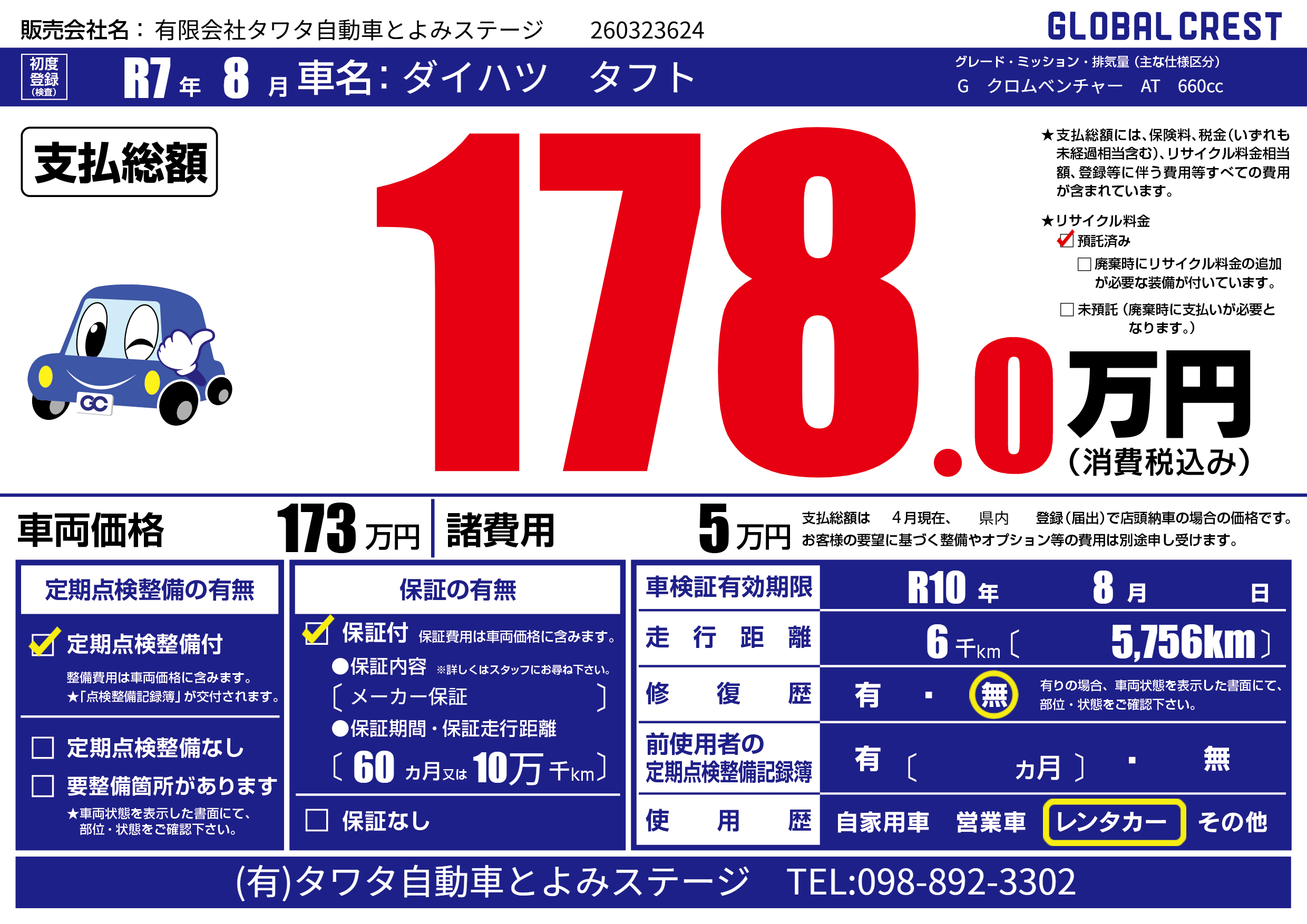 | 車検制限 | R10年 8月 - 日 | ||