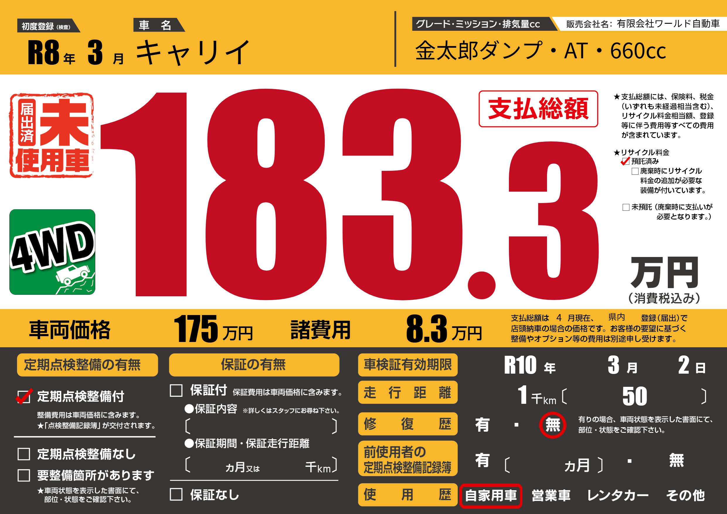 | 走行キロ | 0.1万km | 初年度登録 | R8年3月 |